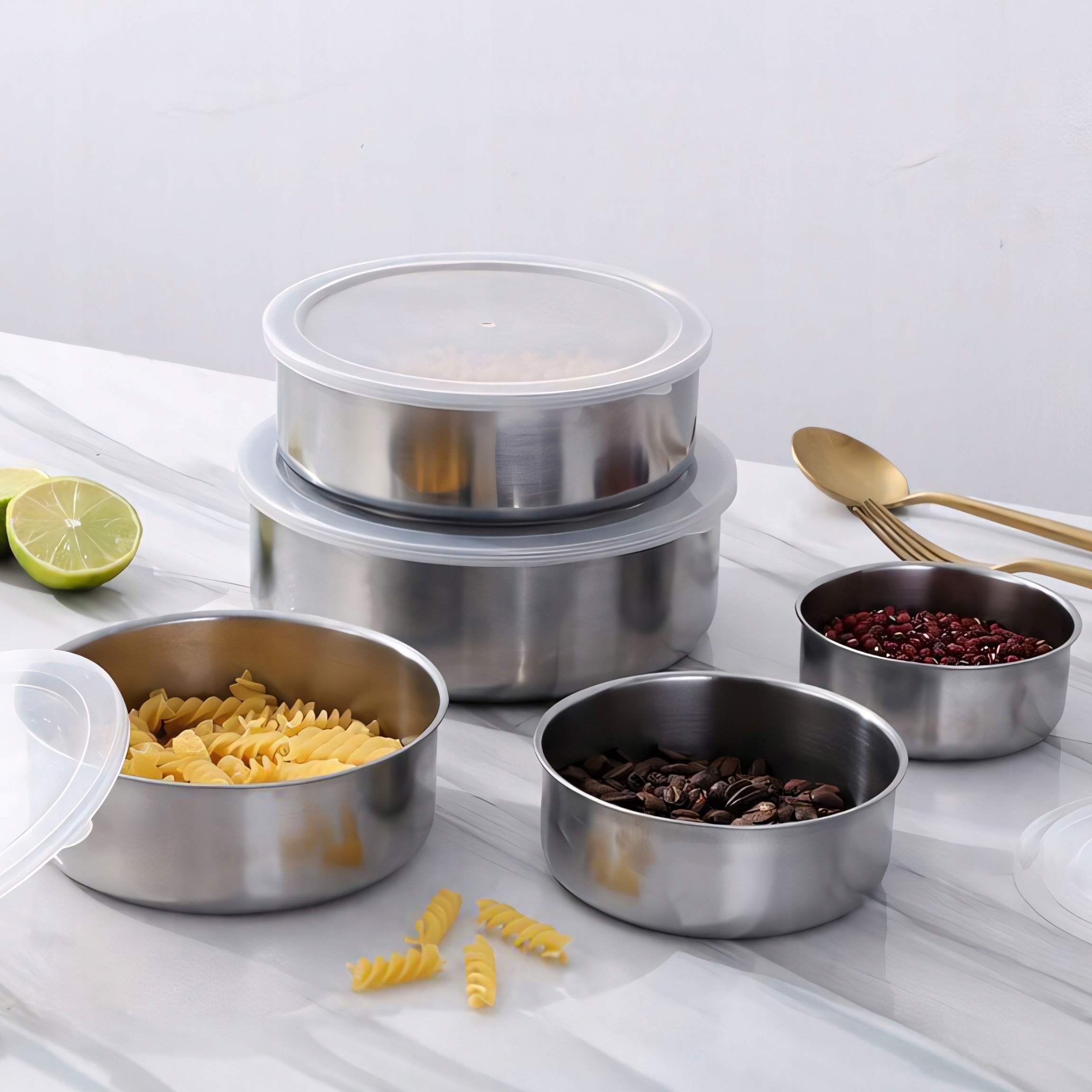 НАБІР КОНТЕЙНЕРІВ ДЛЯ ХАРЧУВАННЯ З 5 КОНТЕЙНЕРІВ З КРИШКАМИ, НЕРЖАВІЮЧА СТАЛЬ