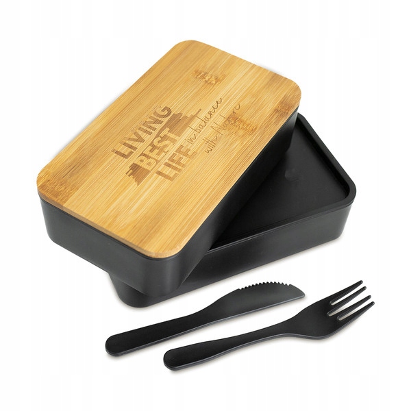 Ланч-бокс закривається на гумку. Має дві ємності ємністю по 500 мл кожна. Оснащений виделкою, ножем і бамбуковою обробною дошкою.