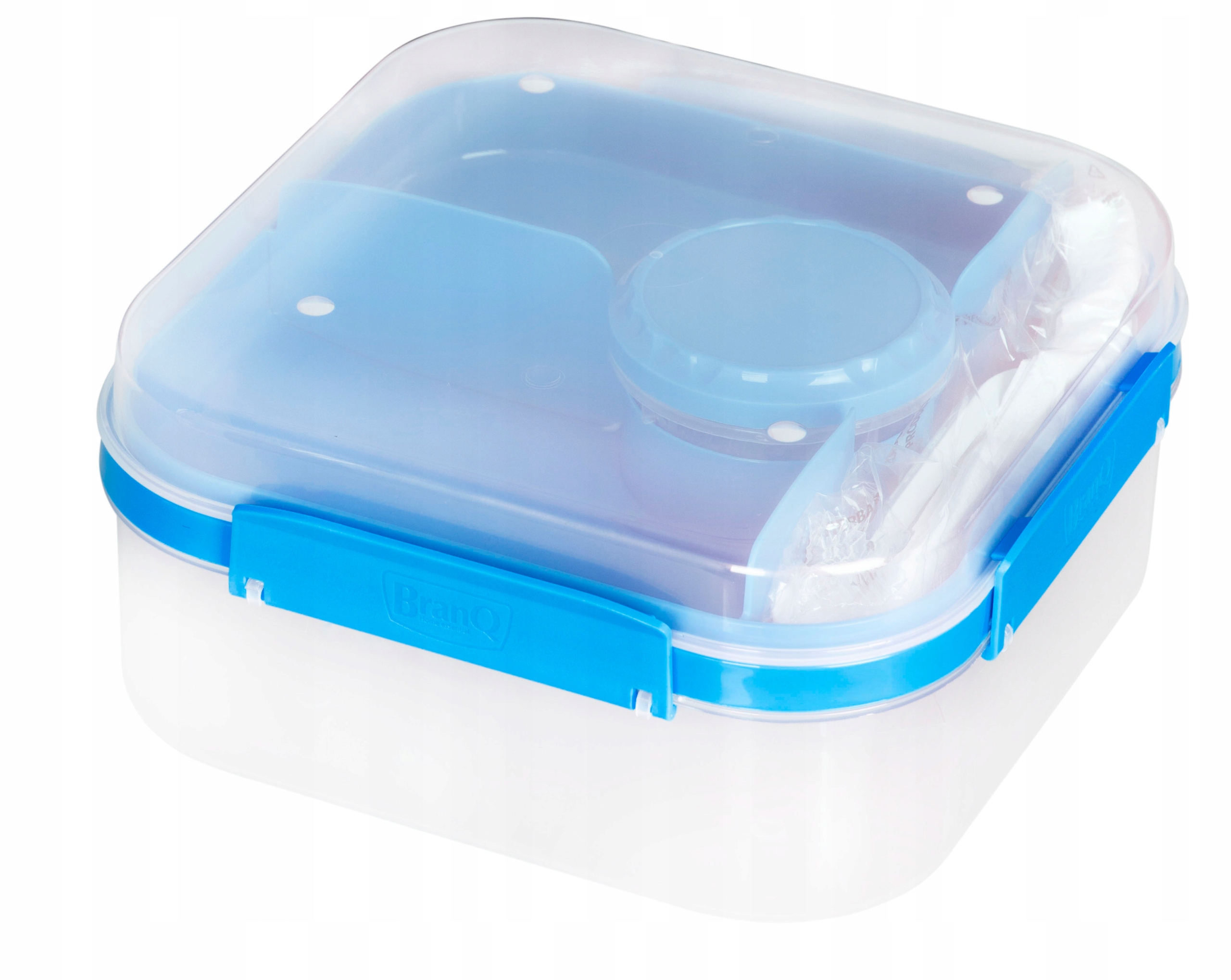 Це кількашаровий ланч-бокс для школи чи роботи. У нижній частині виробу можна зберігати інгредієнти для салату. Середня частина поділена на секції, де можна зберігати хліб і столові прибори (БІОРОЗЛАДНІ у нашому наборі). У набір входить ємність, що загвинчується, для оливкової олії або заправки, смаженого насіння тощо, яку можна використовувати безпосередньо перед вживанням. Кришку контейнера можна використовувати як тарілку.