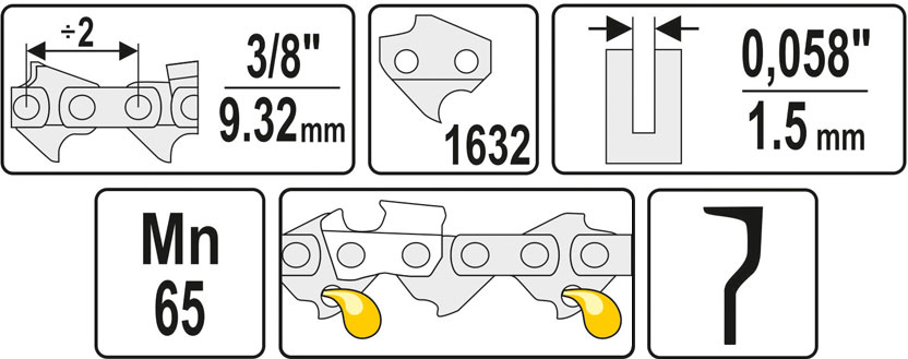 Ланцюг має маркування на ланках «73», що дозволяє визначити його параметри, такі як крок 3/8" і ширина 0,058 ".