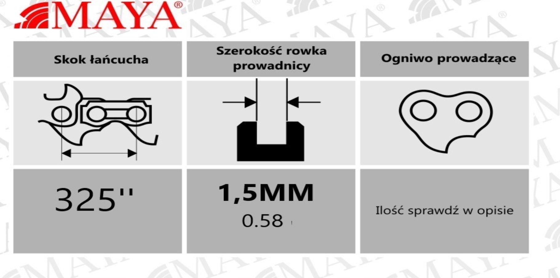 Ланцюг бензопили Maya призначений для різання деревини бензопилою. Виготовлений зі сталі з підвищеною стійкістю до стирання та розриву. Спеціальний профіль мастильних/направляючих ланок зменшує тертя на напрямній і підтримує правильний потік масла. Збільшена товщина штифтів сполучних ланок більш стійка до розриву та розтягування. Ріжучі зуби профільовані та заточені під оптимальним кутом для підвищення ефективності різання.