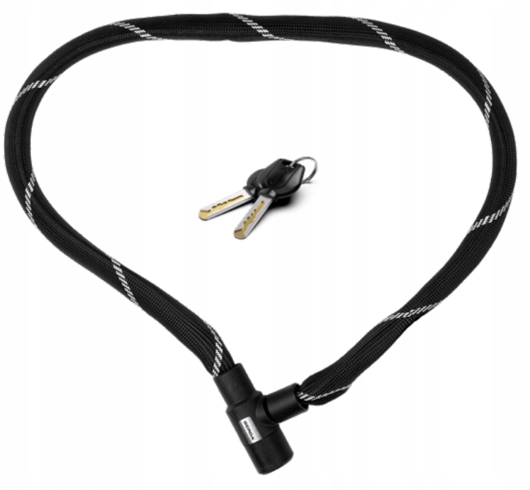 Велосипедний ланцюг із замком - класика кріплення велосипедів. 8 мм сталеві ланки круглого перетину. Текстильний чохол захищає велосипед від подряпин. Автоматична пробка для ключа захищає замок від забруднення. Заглушка отвору для ключа захищає замок від забруднення. Замикання – також із вилученим ключем.