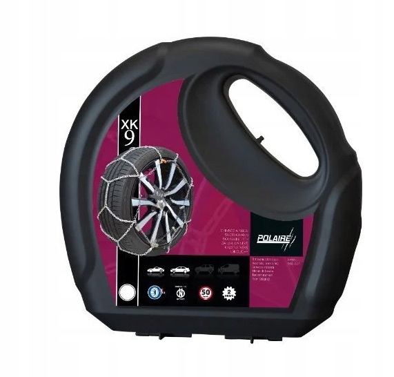 9-міліметрові металеві ланцюги протиковзання POLAR XK9 мають автоматичне багатоточкове натягування та не потребують ручного натягування після запуску автомобіля. Вони надзвичайно довговічні завдяки загартованим і чорним оцинкованим сталевим ланкам (квадрат 3 мм) із високою міцністю (понад 600 кг)