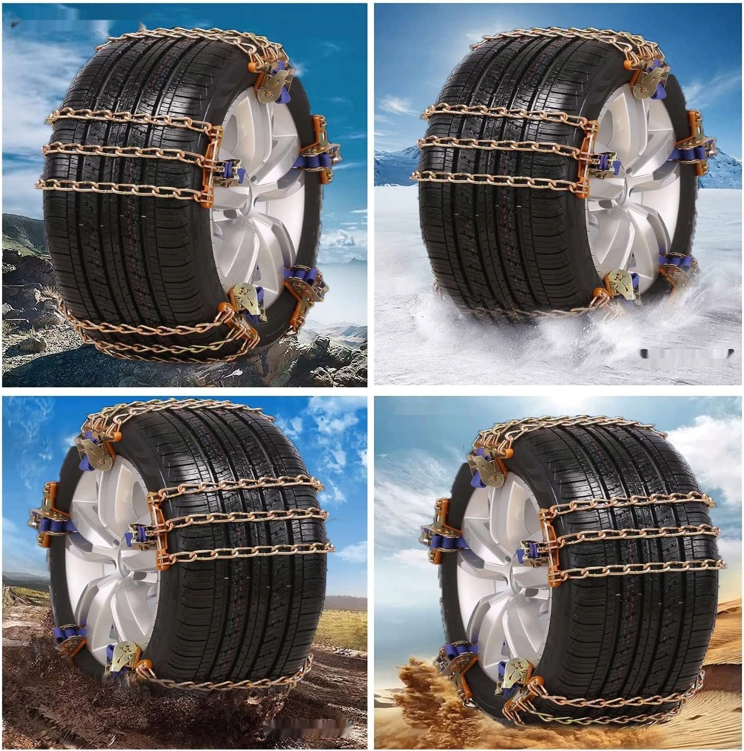 - ⭐ Безпека та довговічність: сітчастий дизайн ланцюга підвищує міцність і протиковзання, що запобігає ковзанню збоку. Діамантовий перехресний малюнок ланцюга забезпечує більш плавну їзду та кращу сумісність із системами ABS, контролю тяги та системами повного приводу (AWD).