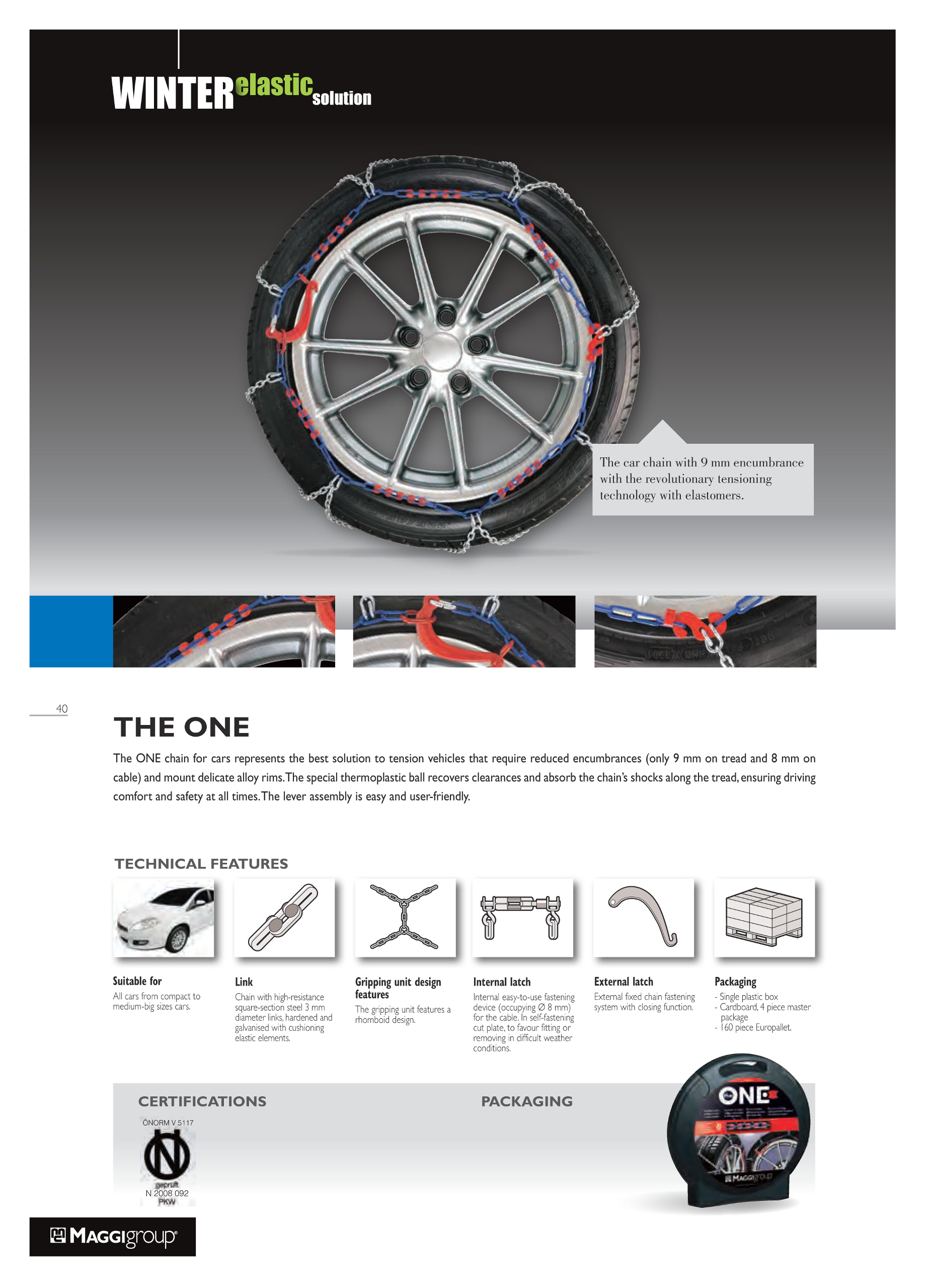 Революційний продукт, який використовує запатентовану систему самонатягування з термопластичними еластомерами, що забезпечує високу стійкість до низьких температур і високу гнучкість. Ряд сферичних елементів забезпечує належні умови роботи ланцюга та високу стійкість до навантажень, створюваних дорожнім покриттям.