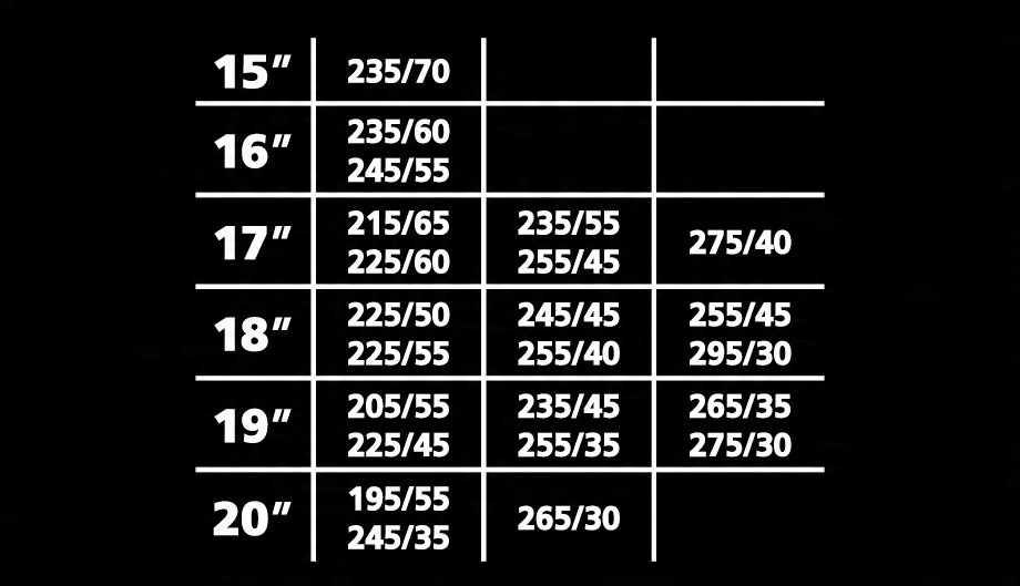 Ланцюги підходять для коліс із розмірами шин: