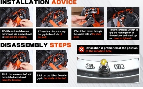 - Перед покупкою зверніть увагу: підходить для коліс з інтервалом між отворами; в негоду їздити обережно, не перевищувати швидкість 40 км/год; установка поблизу вентиляційних отворів заборонена; тривалий рух по звичайних дорогах заборонено, рекомендується їздити по дорогах, вкритих снігом, льодом і брудом. Якщо ланцюг зісковзне із засувки, негайно вилучіть його з експлуатації.