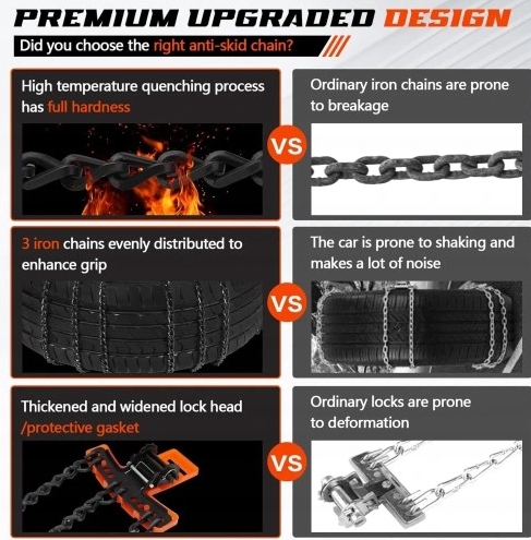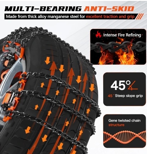 - Високоякісні ланцюги протиковзання: ланцюги протиковзання виготовлені з високоякісної потовщеної марганцевої сталі з нейлоновими кріпильними ременями, які витримують температуру до -50 °C. Вони міцні та довговічні та не пошкоджують шини. Їх можна встановити на одну шину або розкласти 3/3 на дві шини.