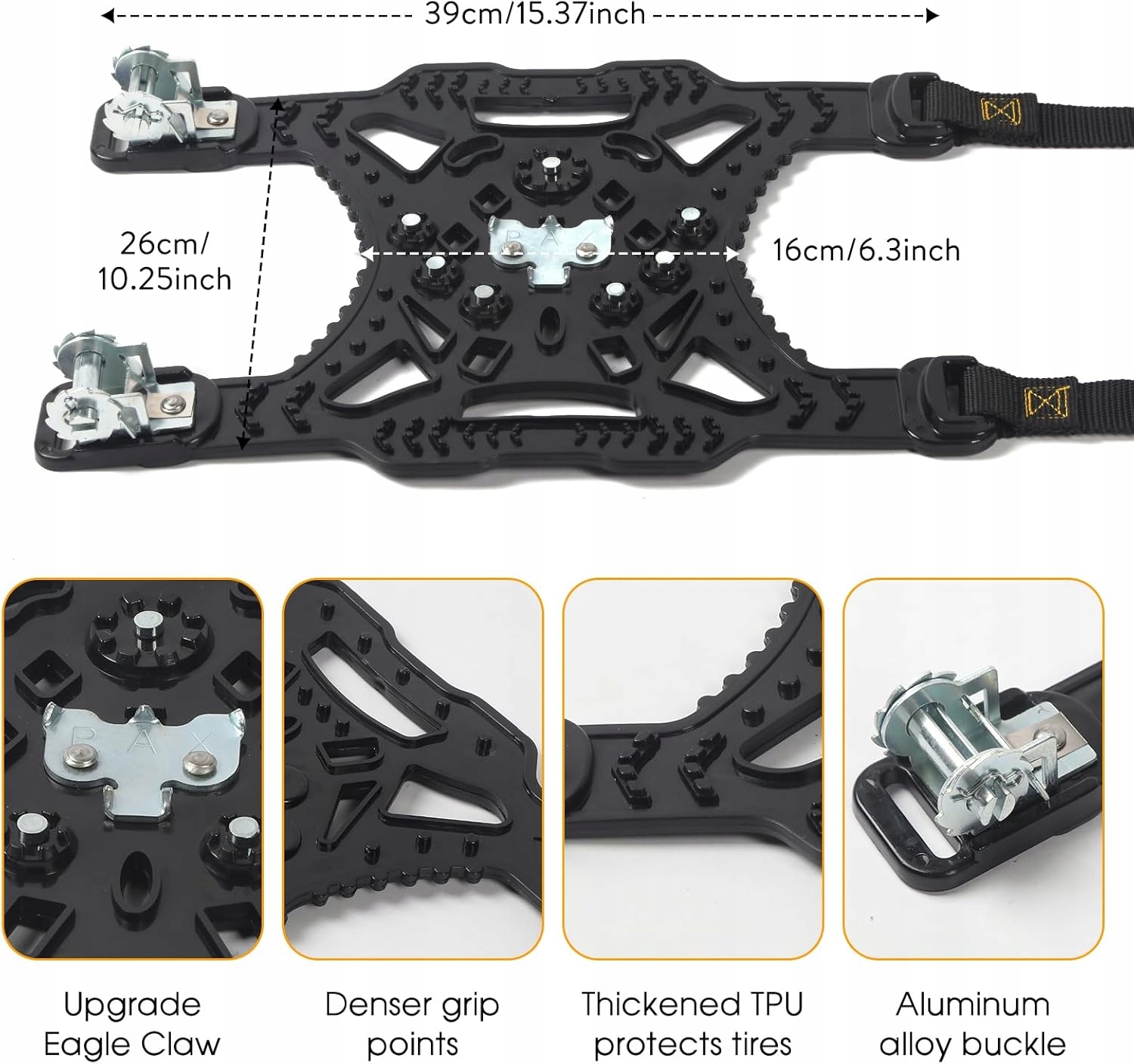 - ☃ 【краща адгезія та анти -слиз】 Поверхня снігових ланцюгів була виготовлена з сильних сталевих нігтів та вдосконаленої кігті марганцевого сталевого орла. Марганцева сталь міцна і міцна, з сильною ручкою, сильною здатністю зламати лід і плавніший водіння. і скорочує гальмівний шлях, забезпечуючи безпечну подорож.
