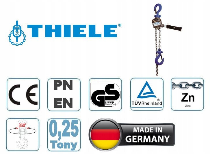 - Ланцюговий підйомник Thiele — це міцний невеликий інструмент, який забезпечує ефективне та безпечне підйом і кріплення різних вантажів.