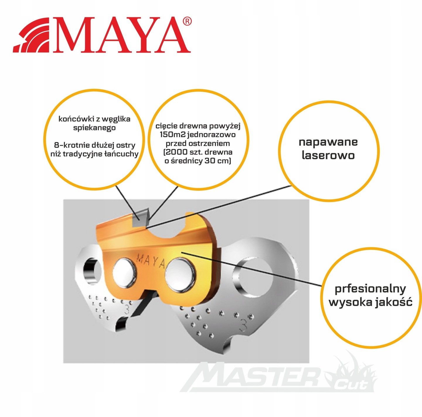 Ланцюги MAYA призначені для професійних користувачів, які працюють у брудних та екстремальних умовах праці. У піщаних місцевостях, у лісах після пожеж або в ситуаціях, коли звичайні ланцюги передчасно виходять з ладу. З ланцюгом MAYA ви можете працювати в таких складних умовах до трьох разів довше, ніж зі звичайним ланцюгом. Надзвичайно міцний хром і сучасний процес гальванізації роблять ланцюг MAYA дуже міцним і залишаються гострим протягом тривалого часу.