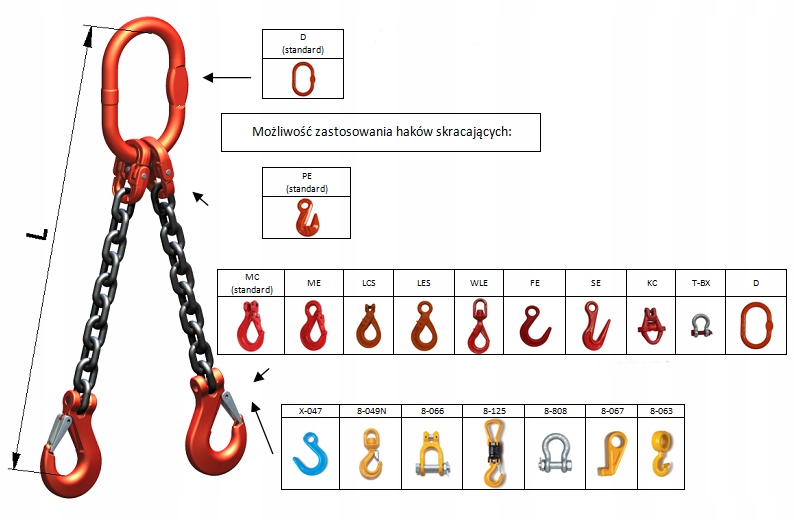 ВИКОНАННЯ: 4-ногий ланцюговий строп, виготовлений відповідно до PN-EN 818 -4 із сертифікованих компонентів і підвісного ланцюга з міцністю на розрив 800 Н/мм2 / GR8 / і відповідає вимогам Директиви про машини 2006/42/EC ред. Травень 2006. Типові випробування проводилися відповідно до процедури виробника на випробувальній машині.