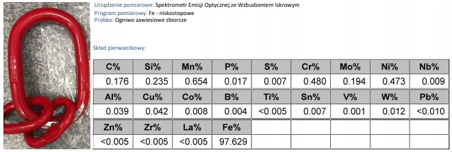 Стропи виготовляються відповідно до стандарту PN-EN 818-4 з перевірених елементів. Ковані сталеві компоненти, які використовуються для виробництва стропів, перевіряються незалежною лабораторією на відповідність стандарту PN-EN 1677-1 щодо мінімального та максимального відсоткового вмісту алюмінію, нікелю, хрому, молібдену, сірки та фосфору, з яких вони виготовлені. Від цього безпосередньо залежать параметри міцності та якості стропів, а отже і безпека.