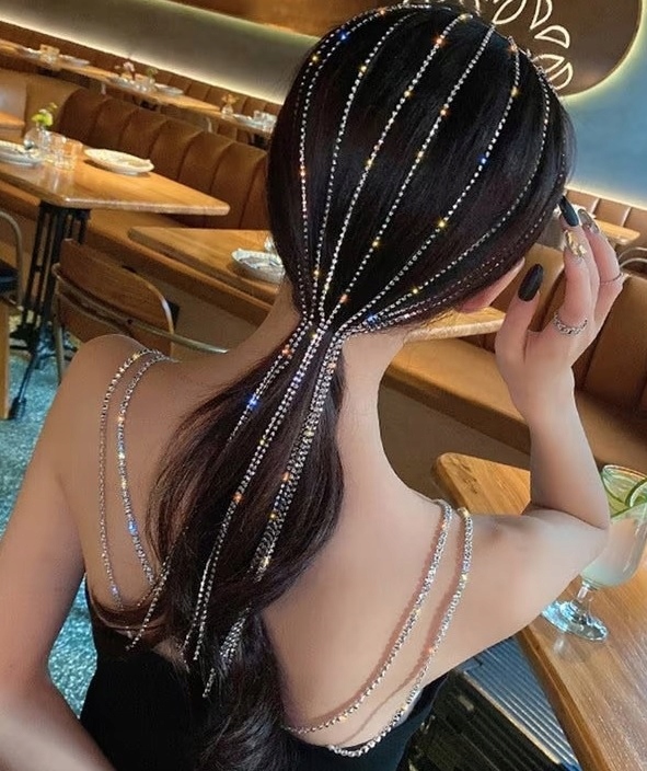 2 ланцюжки з цирконами на заколці для волосся, вони виблискують, як справжні діаманти, додадуть шарму та зачарують виділятися серед інших, ідеально підходить для будь-яких урочистостей і на кожен день. Їх можна вільно закріпити на волоссі або заплести в косу, бажаний ефект залежить від кількості встановлених ланцюжків