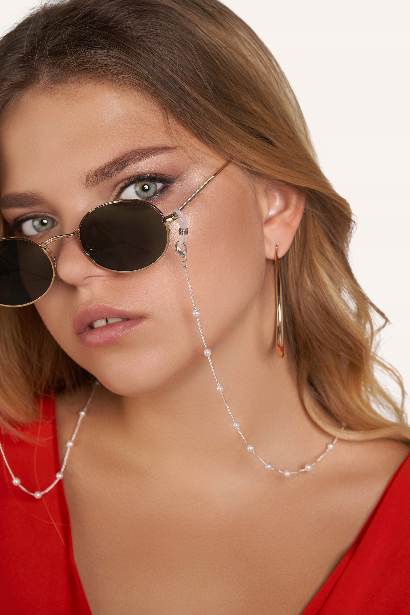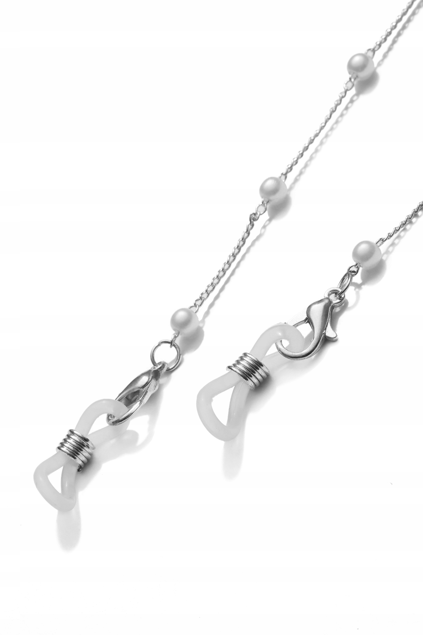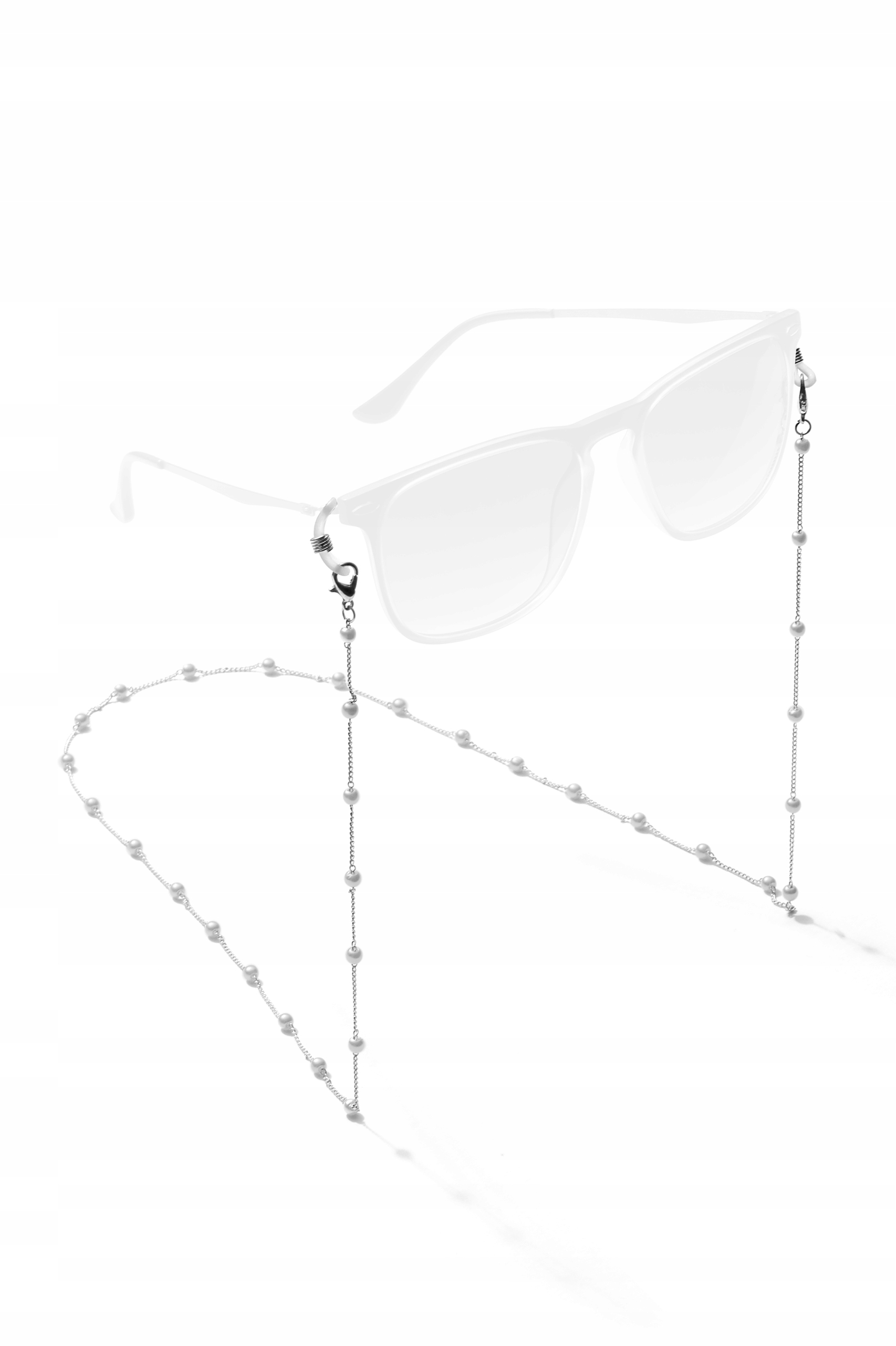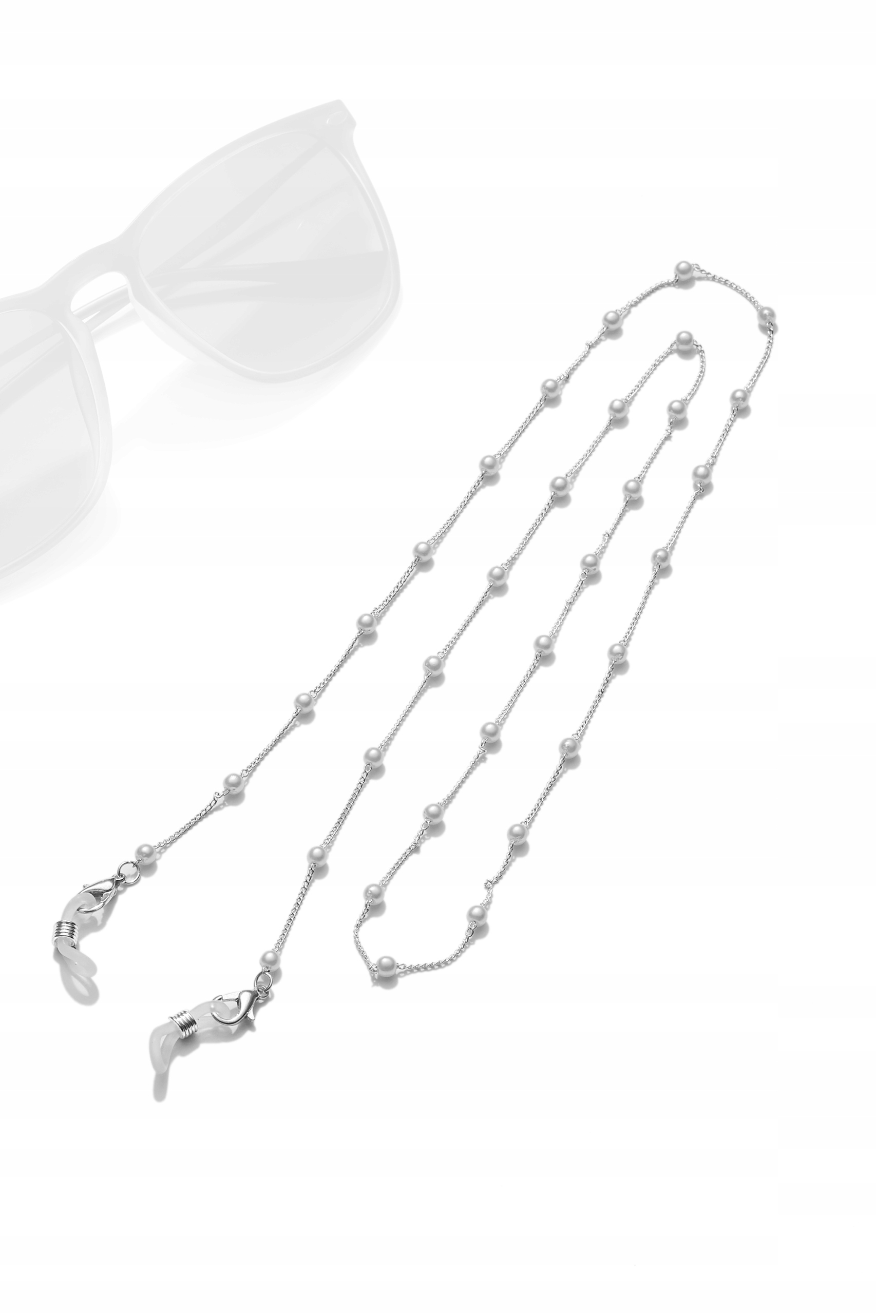Ланцюжок окулярів виготовлений з гіпоалергенного ювелірного сплаву, який не залишає слідів на одязі та шкірі. Аксесуар виконує як естетичну, так і практичну функцію: захищає окуляри від падіння та втрати. Легкий ланцюжок, прикрашений блискучими перлами. Ланцюжок оброблений силіконовими гумками, які полегшують кріплення до дужки окулярів.