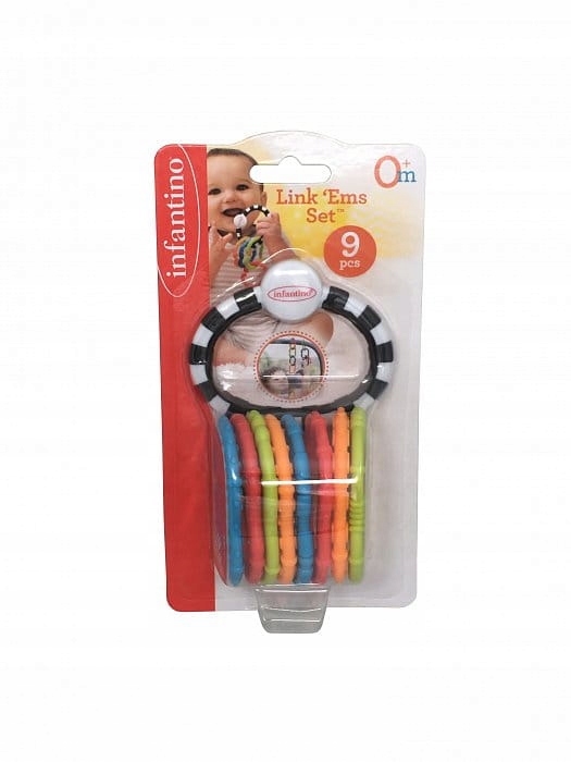 Різнокольорові кола з’єднуються, щоб утворити візерунчастий ланцюжок. Кожен елемент має унікальну текстуру, яка стимулює відчуття дотику. Барвистий ланцюжок можна повісити на сидіння автомобіля або коляску. Їх можна поєднувати як завгодно. Вони також стануть в нагоді для кріплення інших іграшок. Кожен елемент також можна використовувати як прорізувач. Набір ланцюжків створено для творчої гри.
