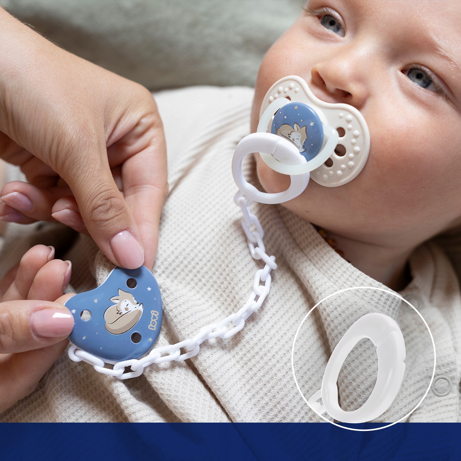 Ланцюжок для соски LOVI оснащено дуже практичним затискачем, який дозволяє надійно та надійно закріпити соску. до одягу дитини. Ланцюжок для соски LOVI захищає пустушку від падіння на землю, втрати чи забруднення.