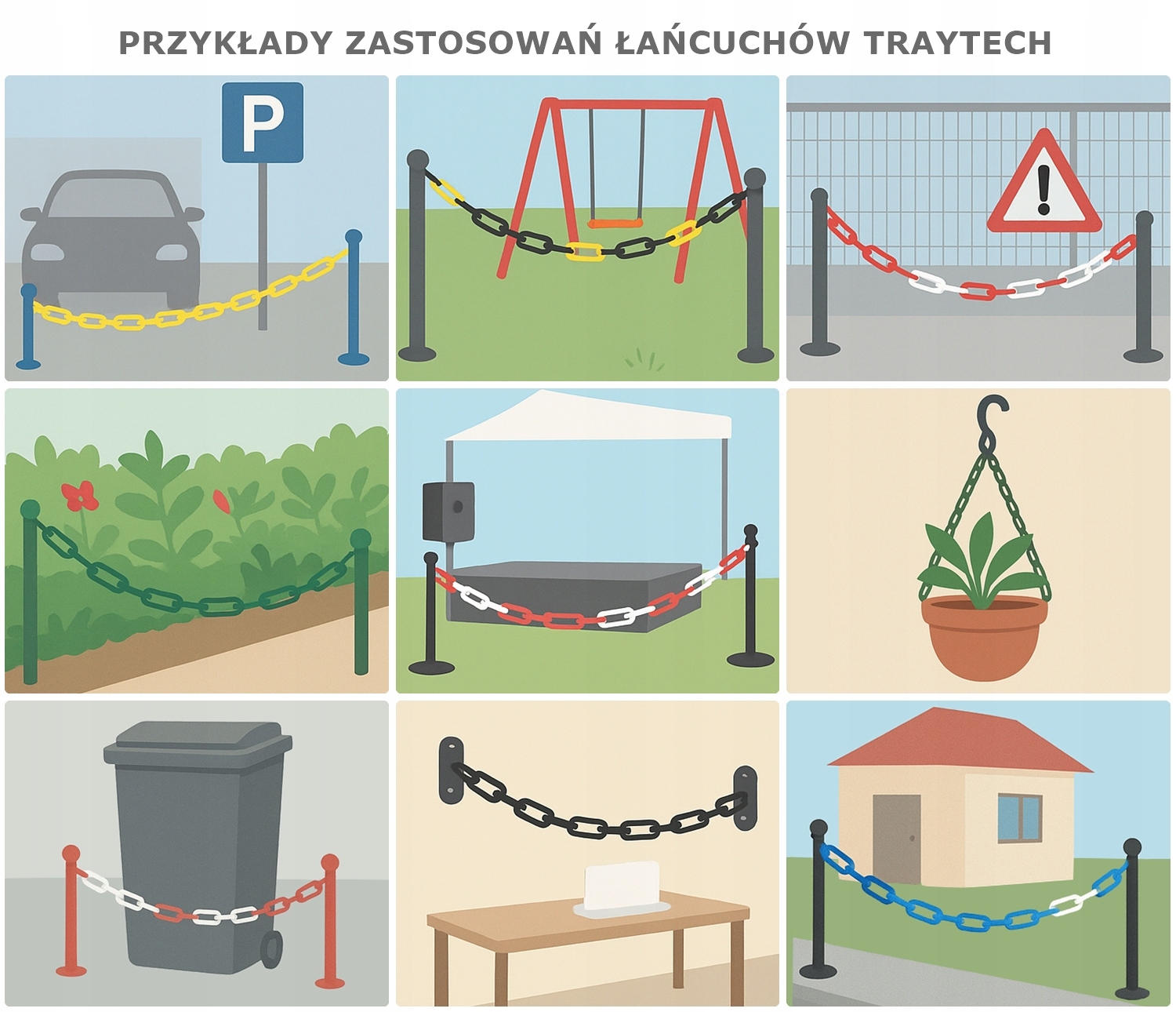 Пластиковий ланцюг також використовується для розділення, серед іншого, комунікаційних шляхів, складських проходів, зон ремонту, обслуговування машин і пристроїв. Це ефективне маркування та захист розкопок, дорожніх робіт, робочих станцій та тимчасово закритих, відокремлених приміщень. Пластиковий ланцюг часто використовується з пластиковими стовпами та дорожніми конусами.