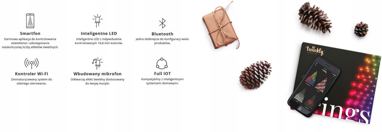 Twinkly — це передові інтелектуальні різдвяні вогники, які можна повісити на ялинку, стіну, вікно та інші місця у вашому домі. Серед доступних моделей у нас є набори на основі світлодіодних ламп високого класу - класичні яскраві кольори від холодного білого, через теплий білий до бурштинового - AWW, а також різнокольорові RGB b> і поєднання першого й другого, тобто RGBW, що дозволить вам обирати з 16 мільйонів кольорів залежно від інтер’єру вашого будинку та ялинкових прикрас.