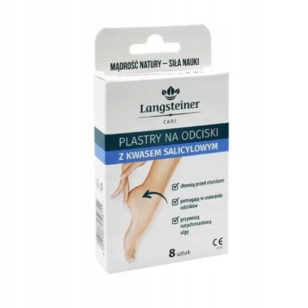 Мозольні пластирі Langsteinerце спосіб мати красиві стопи без непривабливих і болючих мозолів і натоптишів. Саліцилова кислота ефективно розм'якшує мозоль, полегшуючи її видалення. Ціна на мозольні пластирі з саліциловою кислотою вказана за упаковку 8 шт. Для повного видалення мозолі може знадобитися повторне лікування.