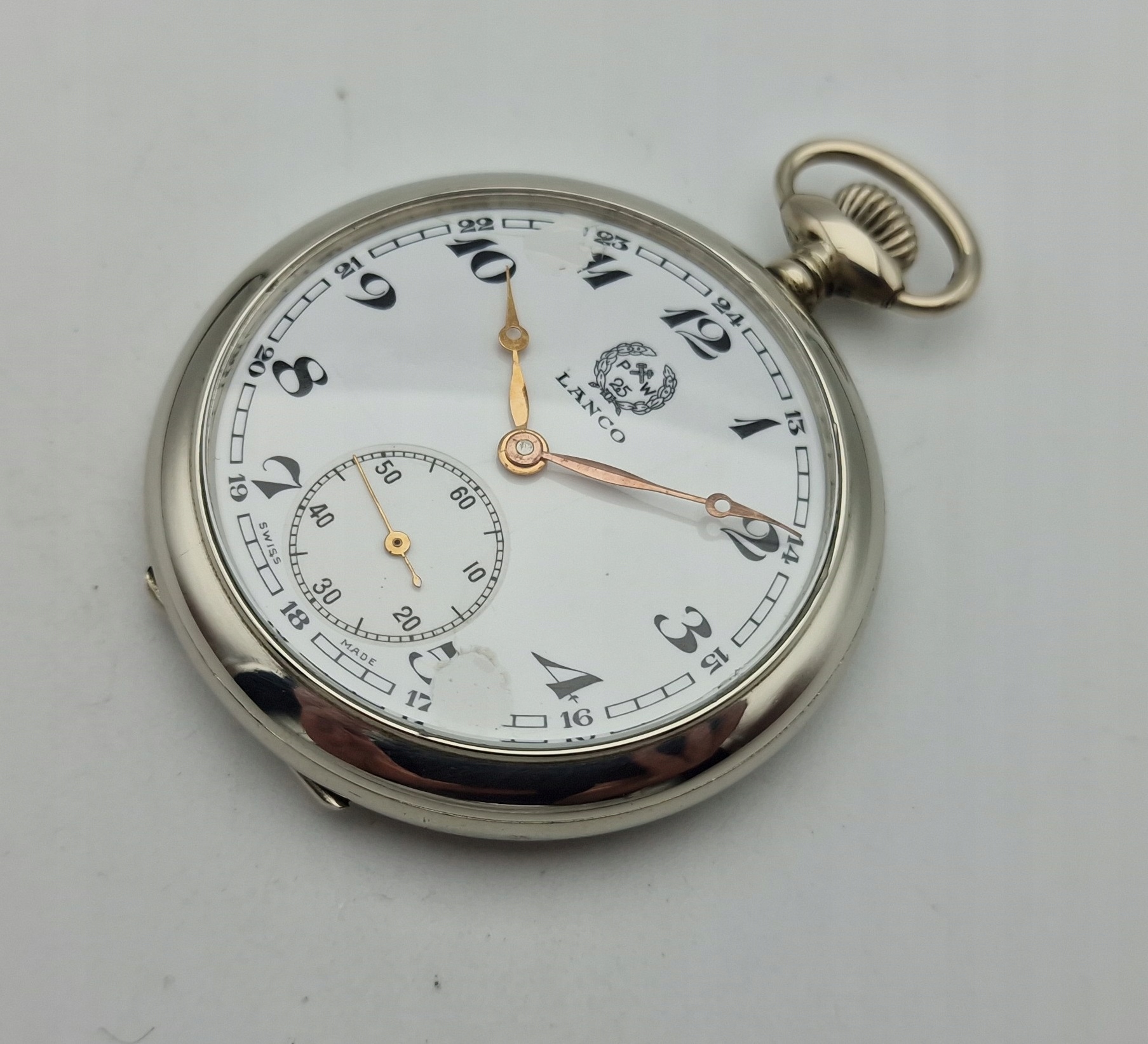 - білий порцеляновий диск з чорними арабськими номерами та окрема секунда о шостій годині. Має підписи: " lanco , швейцарський щит, що зберігається ", зберігається в державі, як у представлених фотографіях.