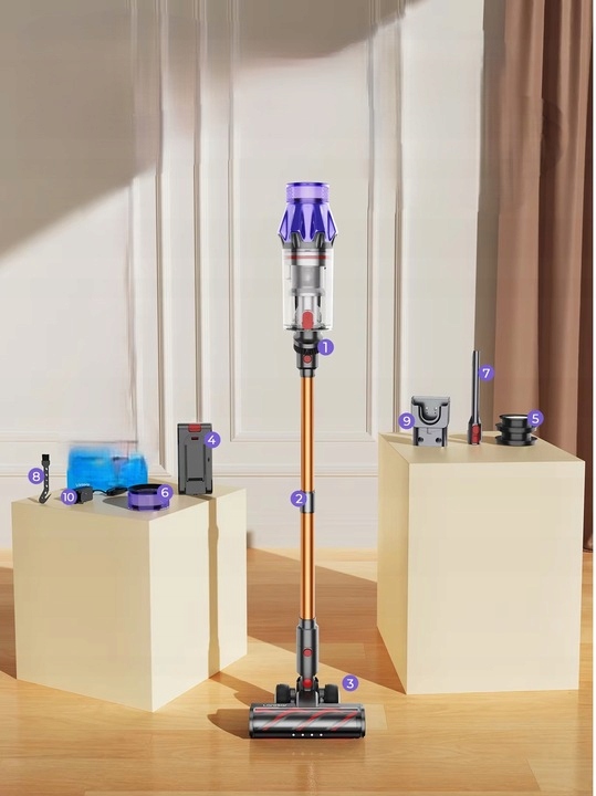 Потужність двигуна: 500 Вт безщітковий Потужність всмоктування: до 50 000 Па Фільтрація: 7-ступінчаста + HEPA Режими всмоктування: Eco / Standard / Max Час роботи від батареї: до 60 хвилин (Eco) Час заряджання: прибл. 4 години Тип батареї: Li-ion 8x2500 mAh Контейнер для пилу: 1,5 л (без мішка) Вага пристрою: < 3 кг Дисплей: Сенсорний LCD Гучність: 68 дБ Розміри: 122 × 25 × 20 см