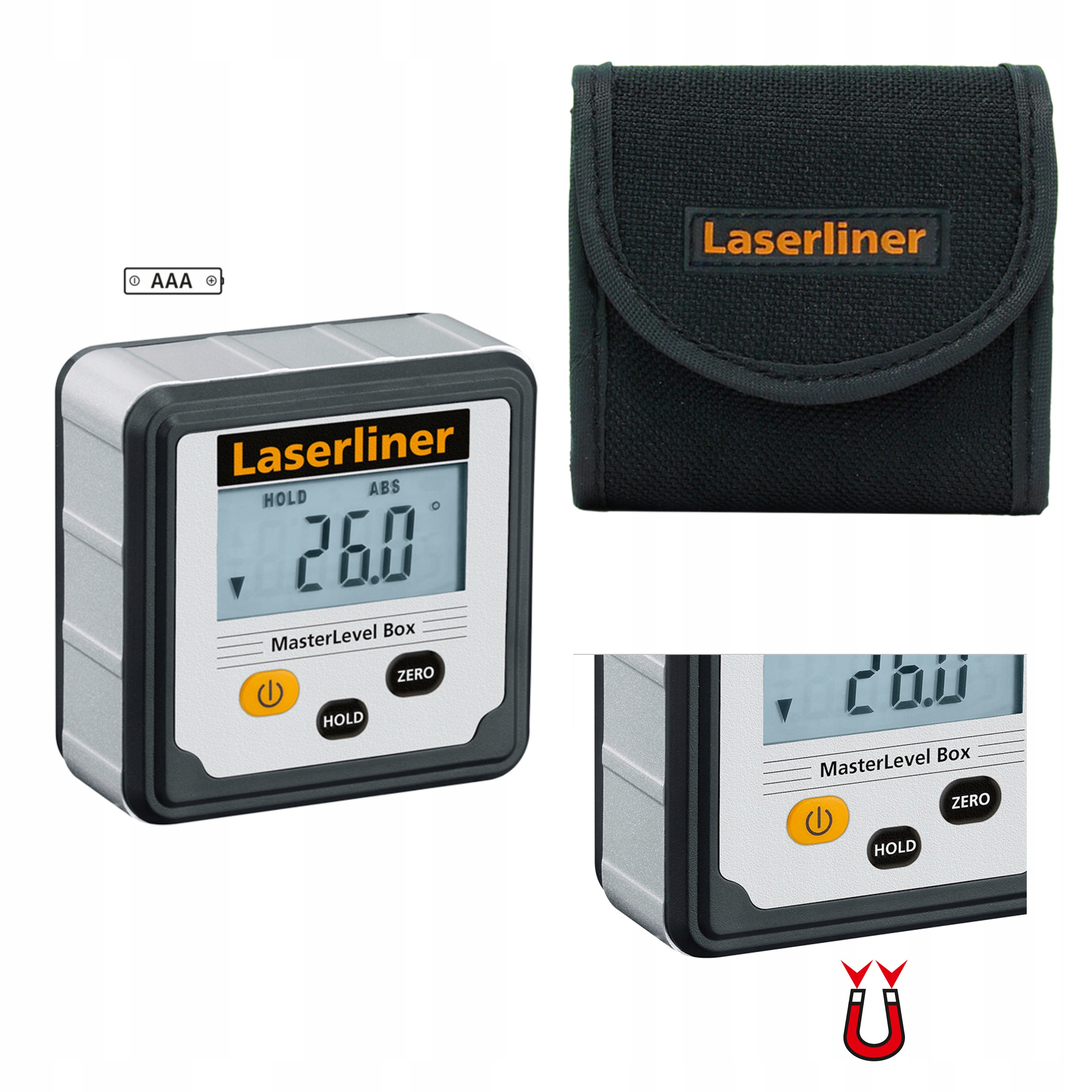 Вимірювання відображається на екрані з підсвічуванням, який автоматично обертається, що робить читання дуже легким. Функція Hold дозволяє поточному виміряному значенню відображатися на дисплеї. Завдяки опорній функції (обнулення, контрольне вимірювання) ми можемо передавати кути на іншу частину конструкції. Сильні клейкі магніти дозволяють зручно працювати зі сталевими конструкціями.