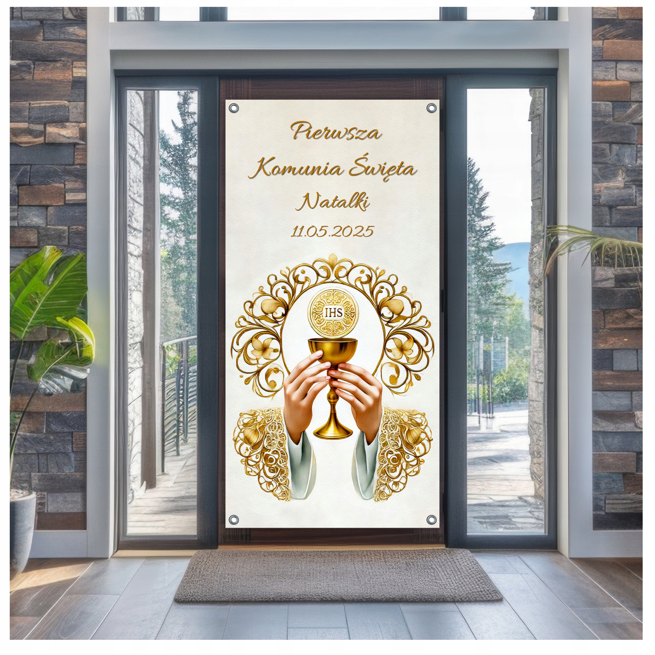 Персоналізований банер для першого Святого Причастя - унікальний сувенір цього важливого дня! Купівля банера для першого Святого Причастя з іменем дитини та дата церемонії - це чудовий спосіб надати події унікальний та особистий характер. Це елегантне та ефективне доповнення, яке підкреслить унікальність першого святого причастя і зробить цей день ще більш незабутнім! Відповідає стандартним дверима, ідеально підходить для будинків, церков та інших місць молитви.