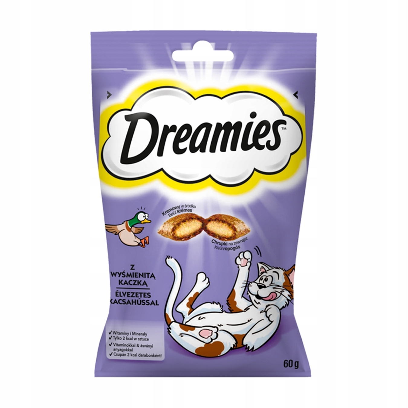 Dreamies з качкою — унікальні ласощі, які поєднують хрустку спокусливу оболонку з кремовою апетитною начинкою, створюючи унікальне поєднання смаків і текстур. Коти просто не можуть перед ними встояти – їхній неймовірний смак і хрустка поверхня з м’якою внутрішньою частиною роблять ці закуски непереборним вибором.