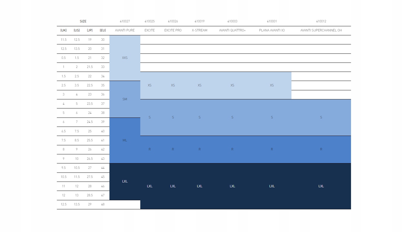 Примітка. Таблиця розмірів ласт Avanti Pure OH стосується використання цієї моделі босоніж (без взуття). Якщо ви використовуєте їх із взуттям, ми рекомендуємо придбати цю модель на один розмір більше.