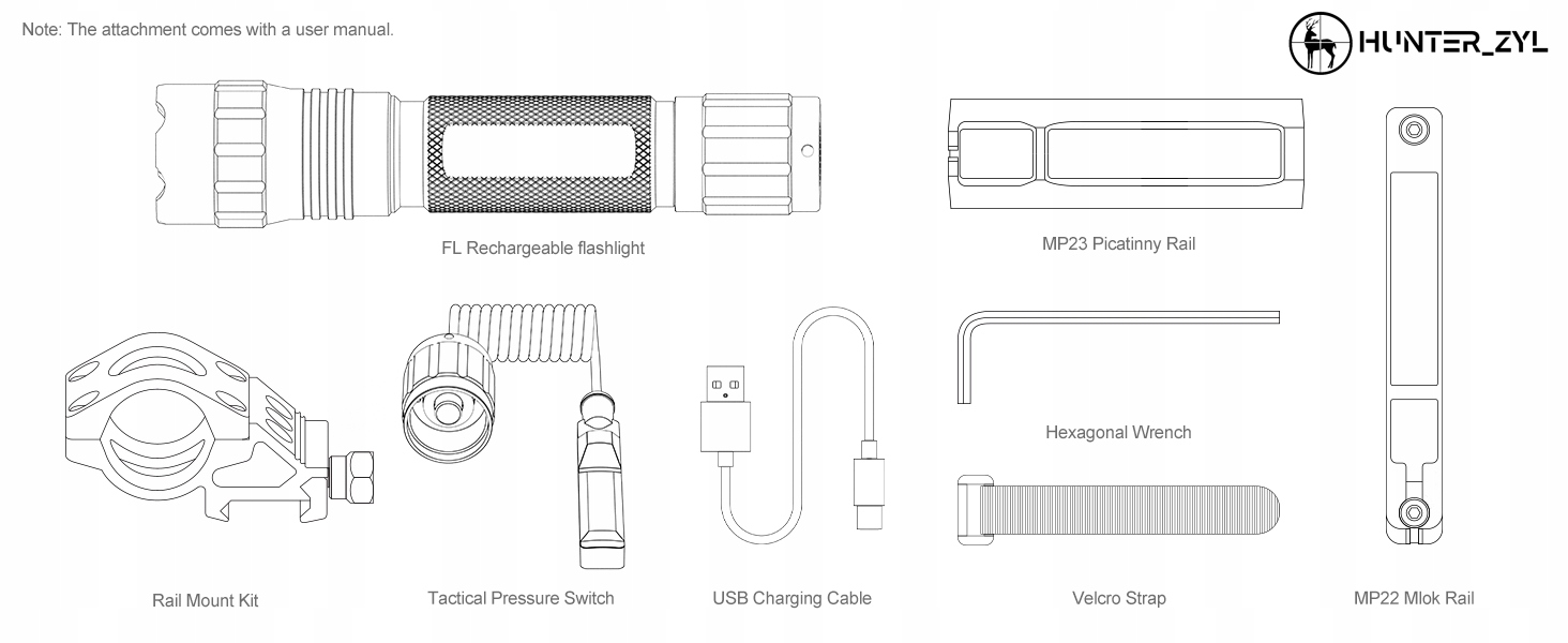 - ви гарантуєте: ліхтар для зброї FL31*1, перемикач зсуву*1, реле тиску*1, амортизатор тиску (Picatinny)*1, амортизатор тиску (Mlok)*1, зарядний кабель типу C*1, зовнішній амортизаторний ключ* 1, посібник користувача.< /li>