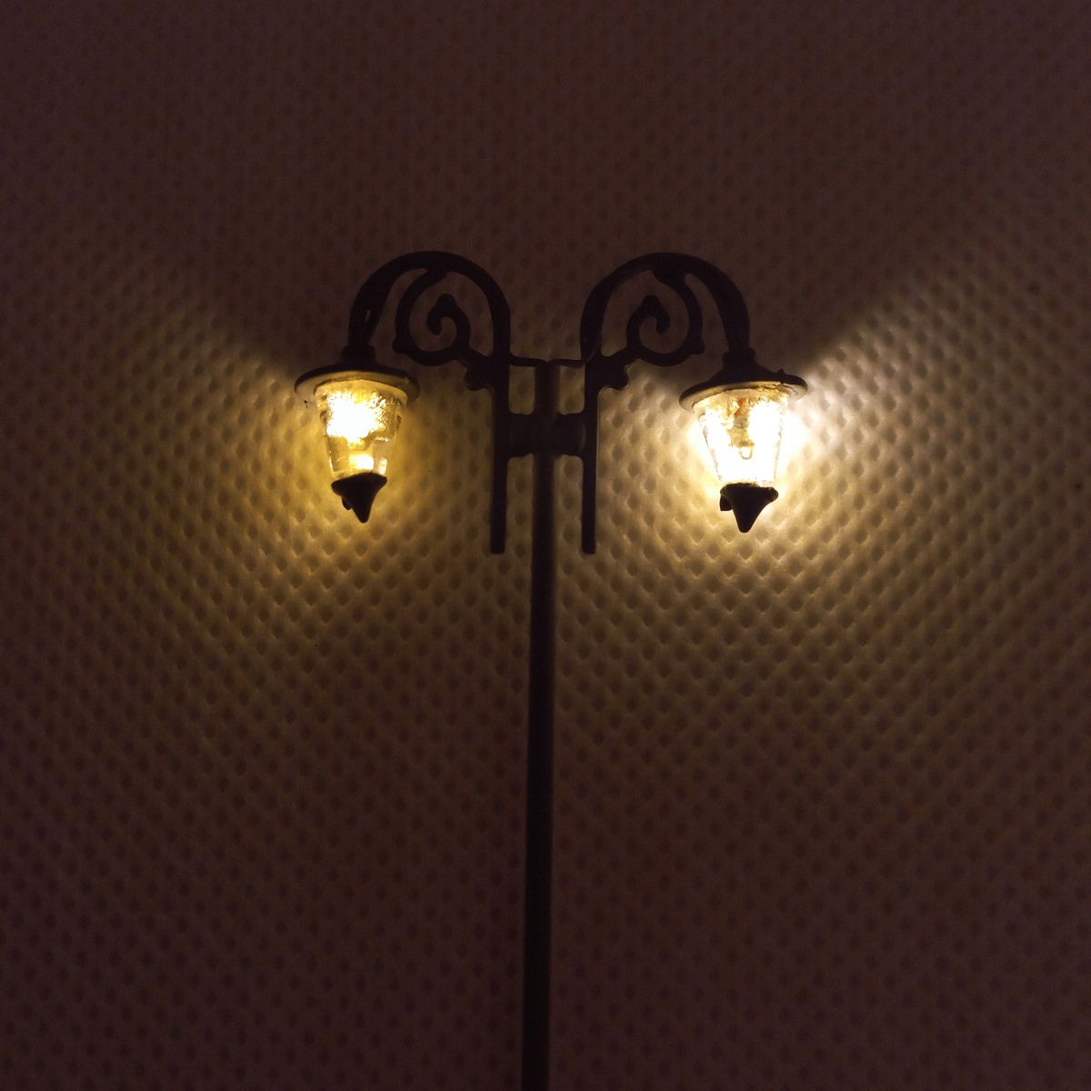 Ліхтар парковий, подвійний ретро теплий білий LED H0, живлення 3В. Можна підключити до стандартного джерела живлення поїзда 12 В за допомогою резистора, що входить до комплекту.