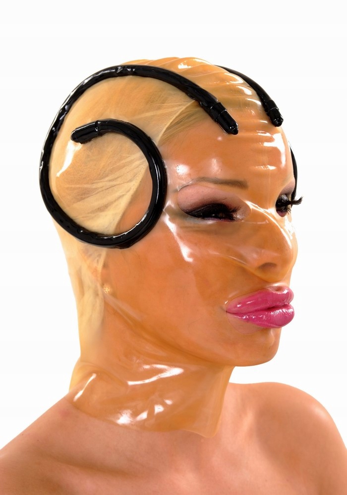 Маска з щільного прозорого латексу. Він прикрашений чорними закрученими кутами (доступні версії різних кольорів).