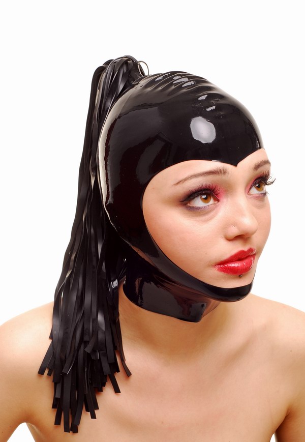 Маска щільно загортає голову, а поні зроблений з тонких смуг латтексу. Обличчя наповнює розріз із серцем.