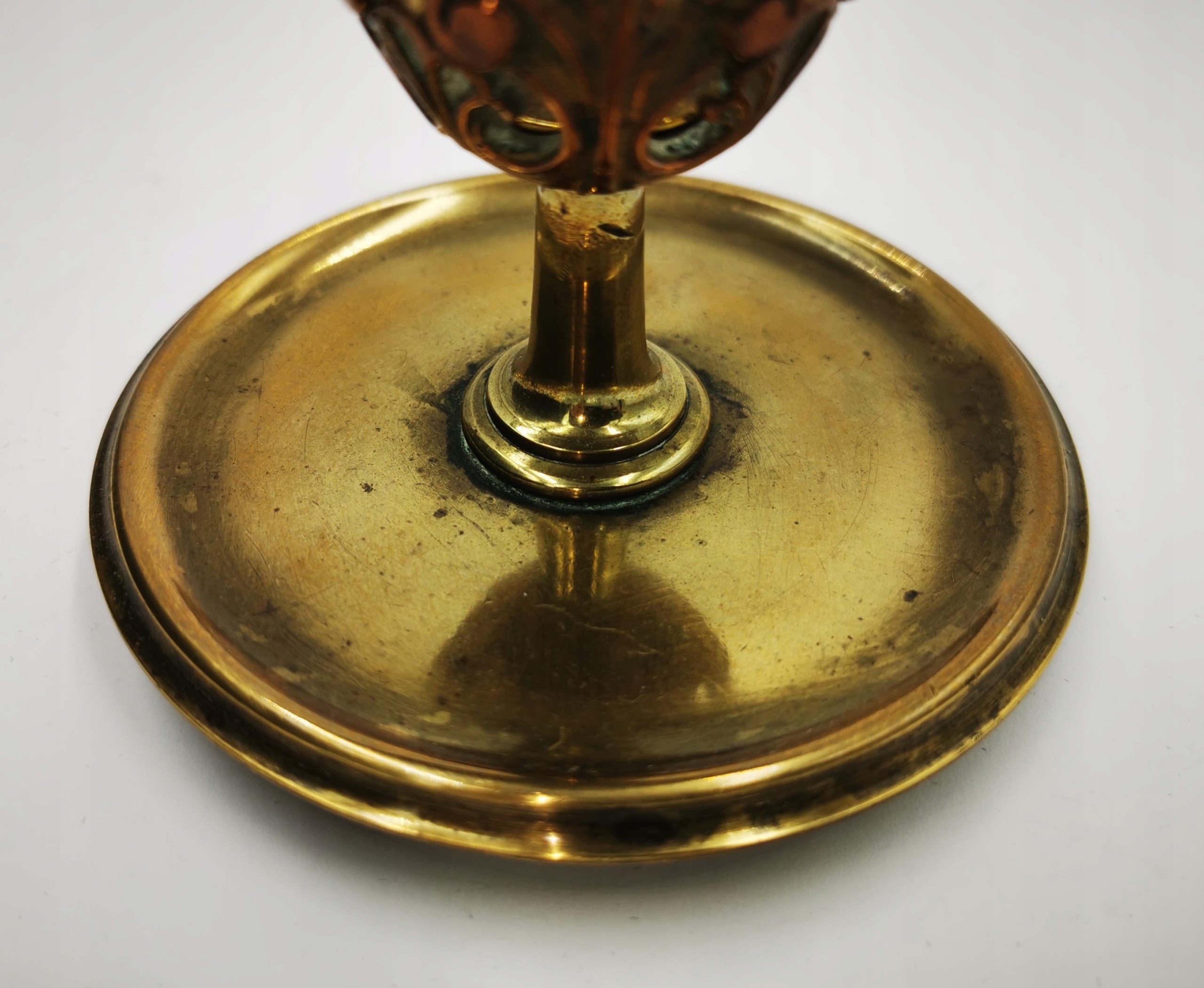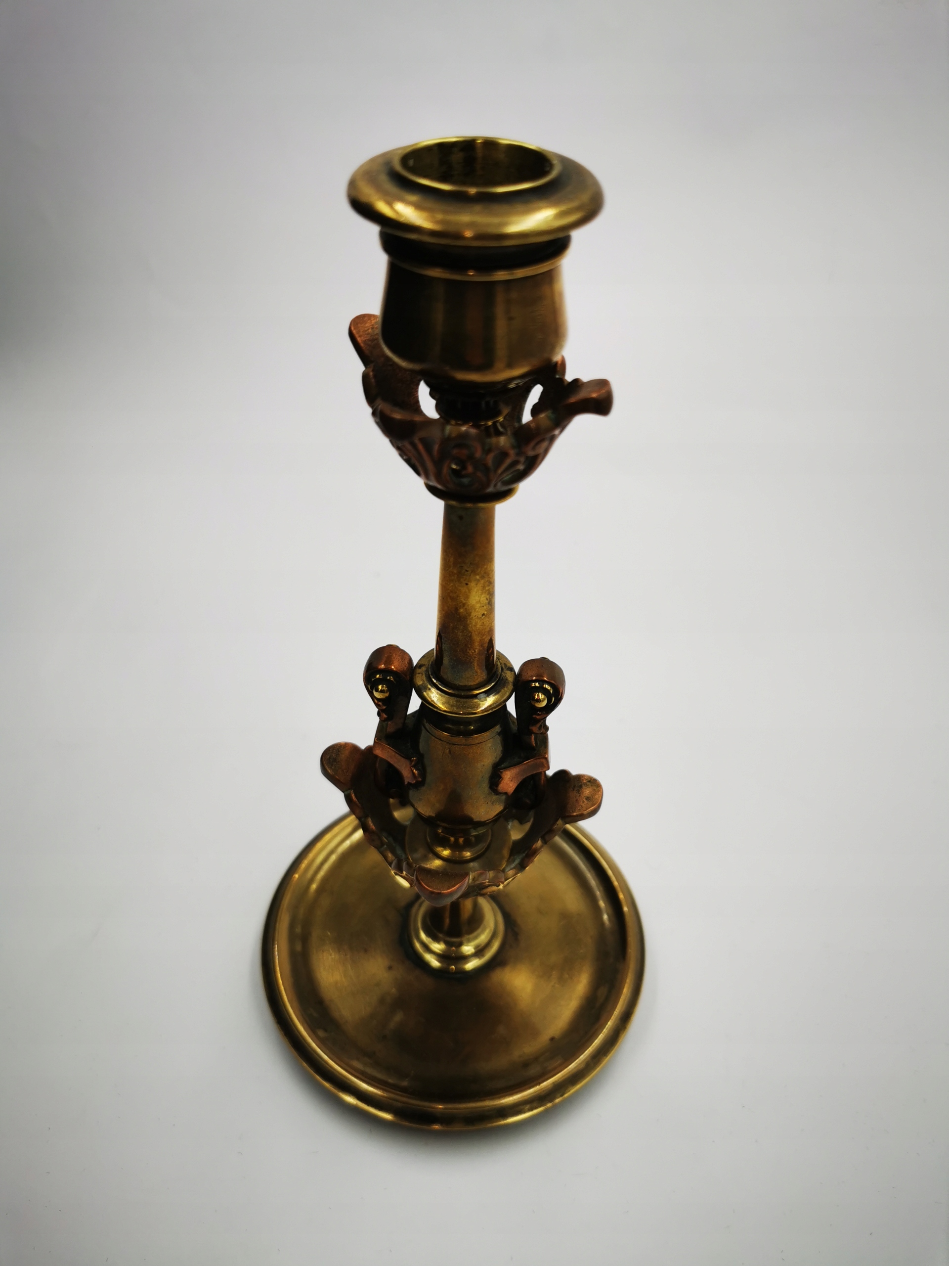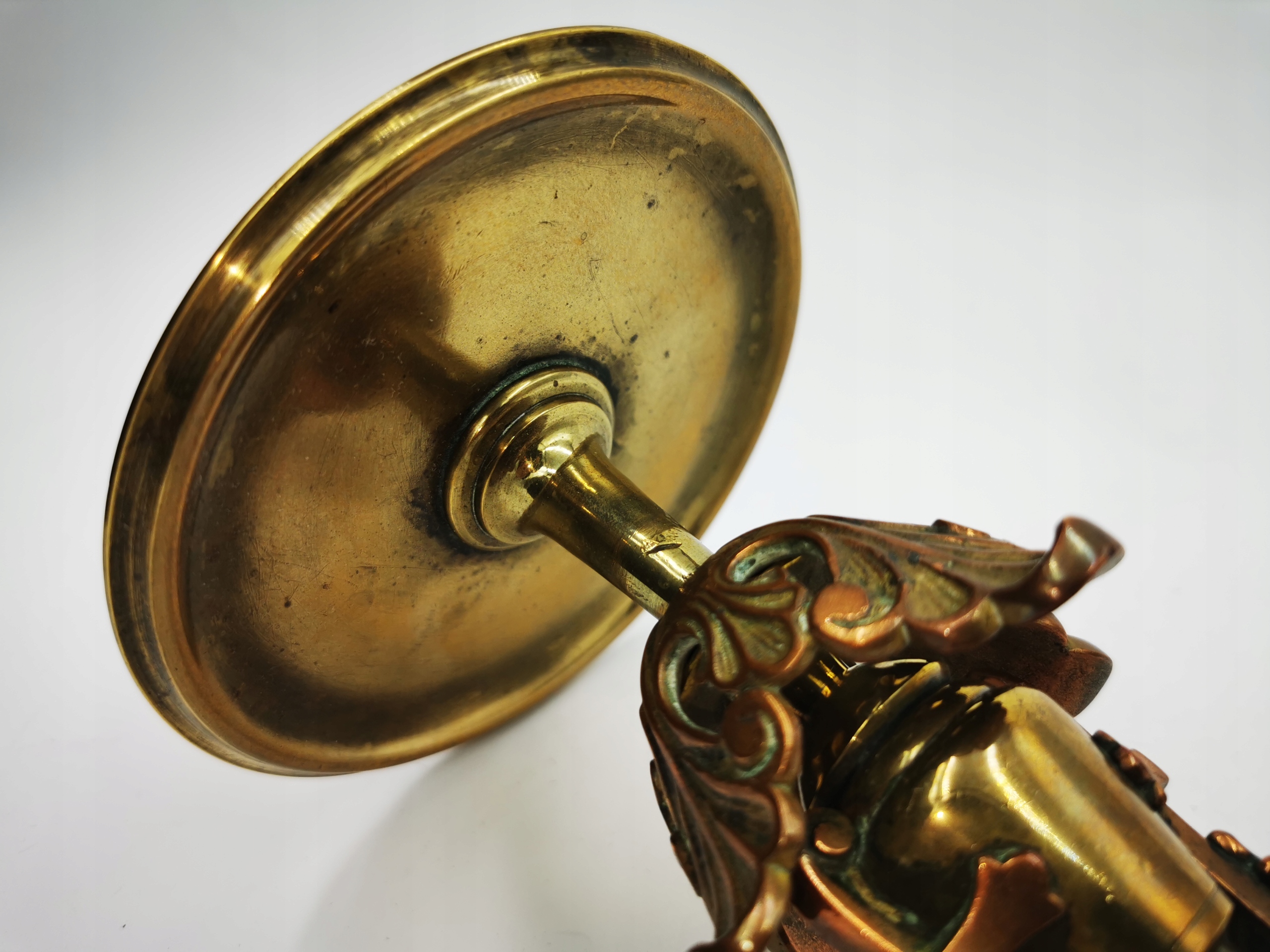 Представляємо підсвічник на одну свічку, виготовлений з комбінації латуні та декоративних елементів з бронзи. Підсвічник має більш широку основу для капання воску. Усе це виглядає надзвичайно декоративно завдяки двом ажурним комірцям, які видно на шийці свічника.