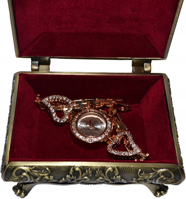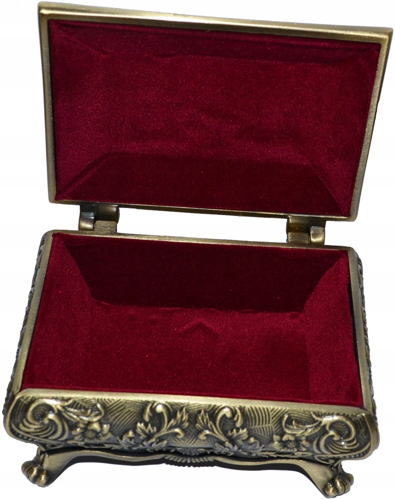 Запрошую придбати гарну коробку в стилі бароко, надзвичайно багато прикрашену рослинними мотивами. Виготовлений з металу, покритий латундю кольору старого золота. Важкий і міцний. Ідеально підходить для упаковки обручки, обручок або подарунка.