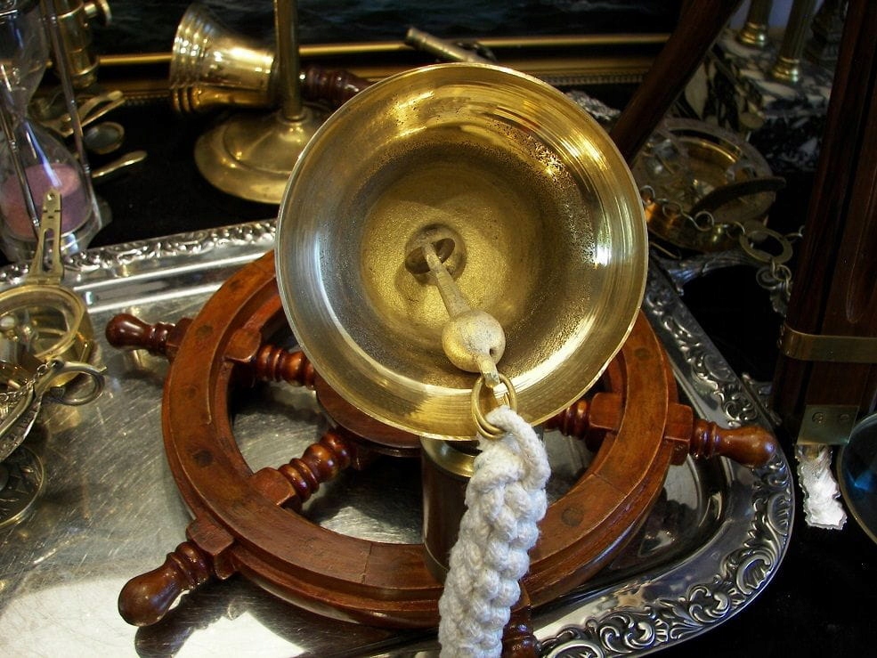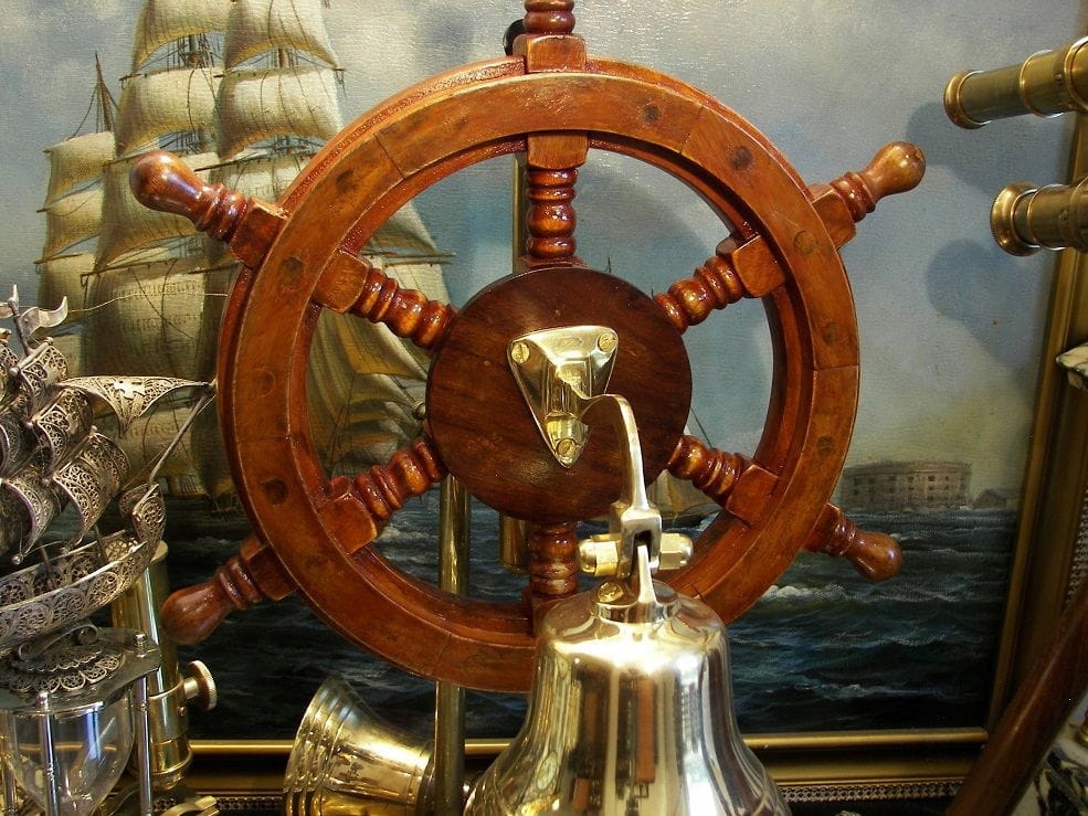 Я запрошую вас придбати красивий латунний корабельний дзвін, який кріпиться до штурвала. Дзвін видає повний і гучний звук. Кермо виготовлено з дерева без використання цвяхів. Темніші плями по периметру, ймовірно, є шпильками.