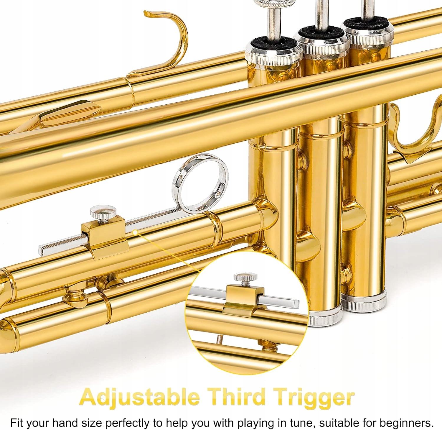 Проект для початківців: Третє регульоване третє кільце на пальці клапана дозволяє переміщувати його ближче, щоб менші руки могли тримати трубу, ідеально підходячи для дітей, студентів чи дорослих з маленькими руками. Мундштук 7c із середньою чашкою допомагає початківцям легко видати звук