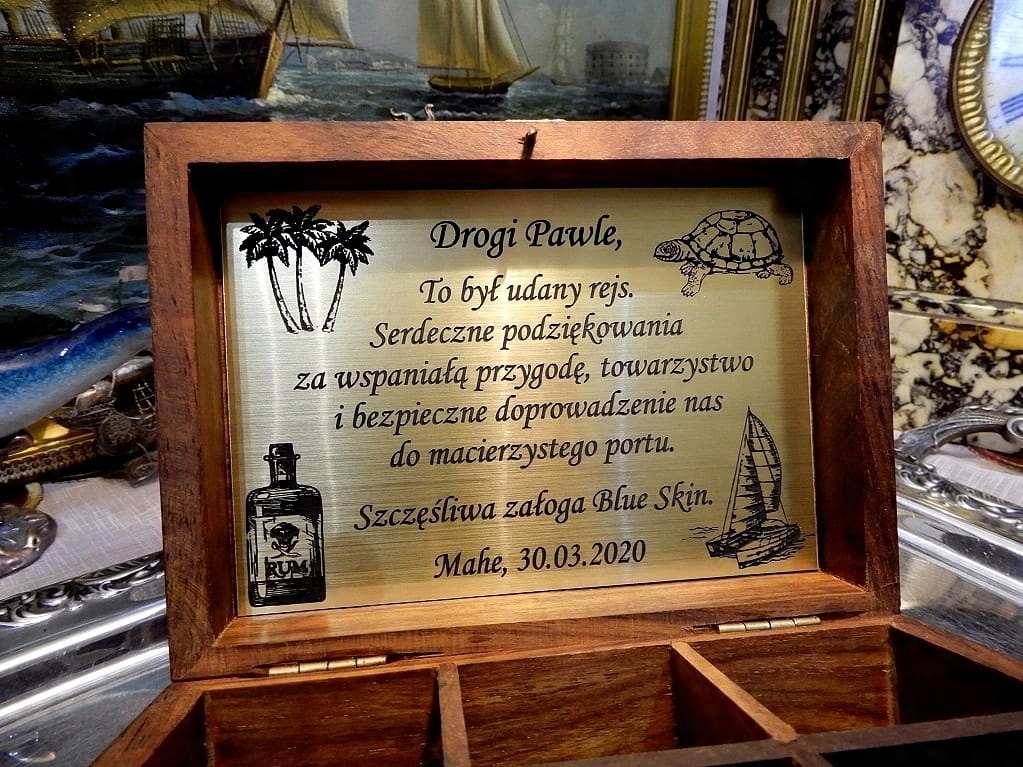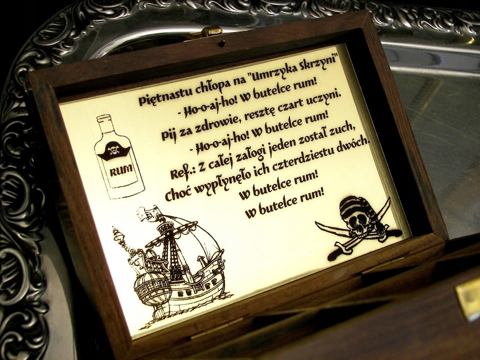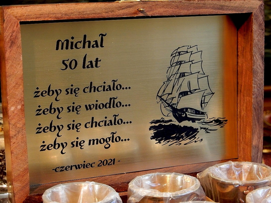 Персоналізація безперечно підвищить сентиментальну цінність цього набору. Гравірування безпосередньо на дереві на гладкій обкладинці або всередині обкладинки на золотому ламінаті. Кількість символів і малюнків не має значення, ціна однакова