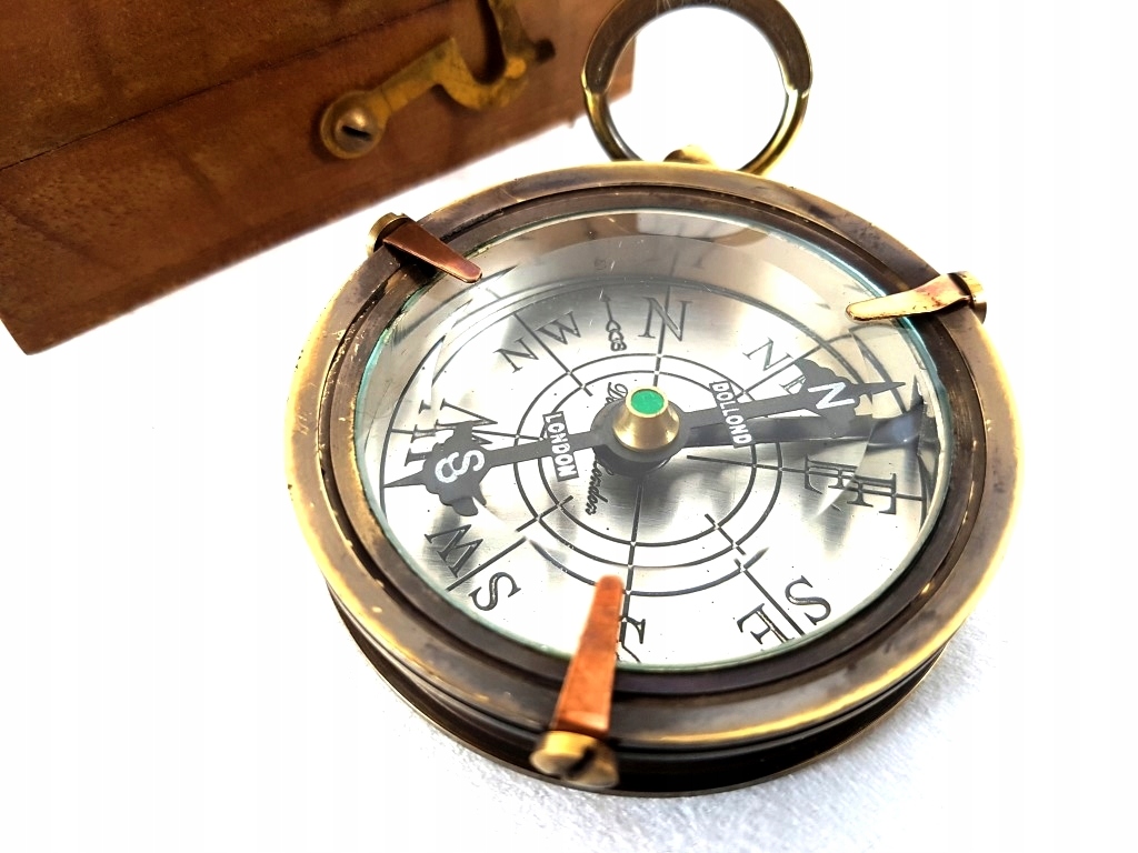 Компас латунний в дерев'яній коробці, диам. 6 см – 70512 – репліка Довжина компаса разом із металевою шпилькою – 9 см Металевий циферблат компаса з розою вітрів. Компас має фіксатор голки. На зворотному боці компаса є напис: Dollond London. Це її величність. Королівський флот. Майстри інструментів – Для найсвітлішої леді. Королівський флот. Виробники інструментів На металевому кільці 1920 р. Дерев'яна коробка з повстяною підкладкою 8х8х4,5 см
