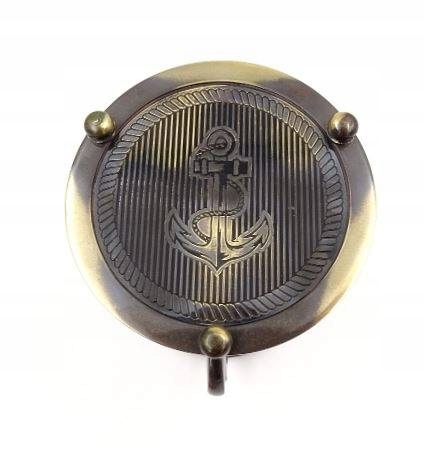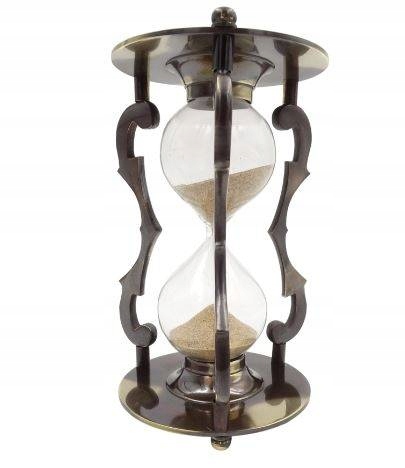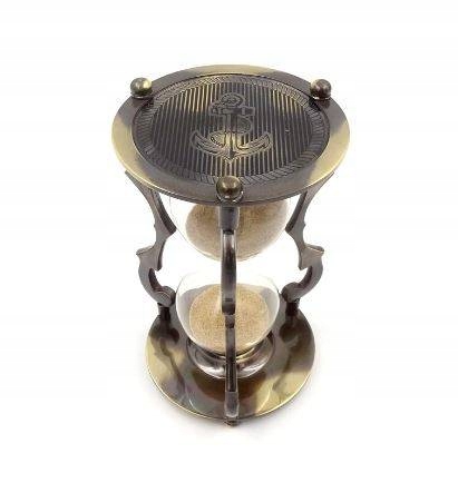 Пісочний годинник із латуні в античному стилі, встановлений у прикрашеній латунній конструкції. Зверху та знизу увінчаний символічним якорем. Художня майстерність. Вишуканий декоративний елемент, який також може бути корисним інструментом на кухні. Також він ідеально підходить для оформлення кабінету моряка чи мандрівника.