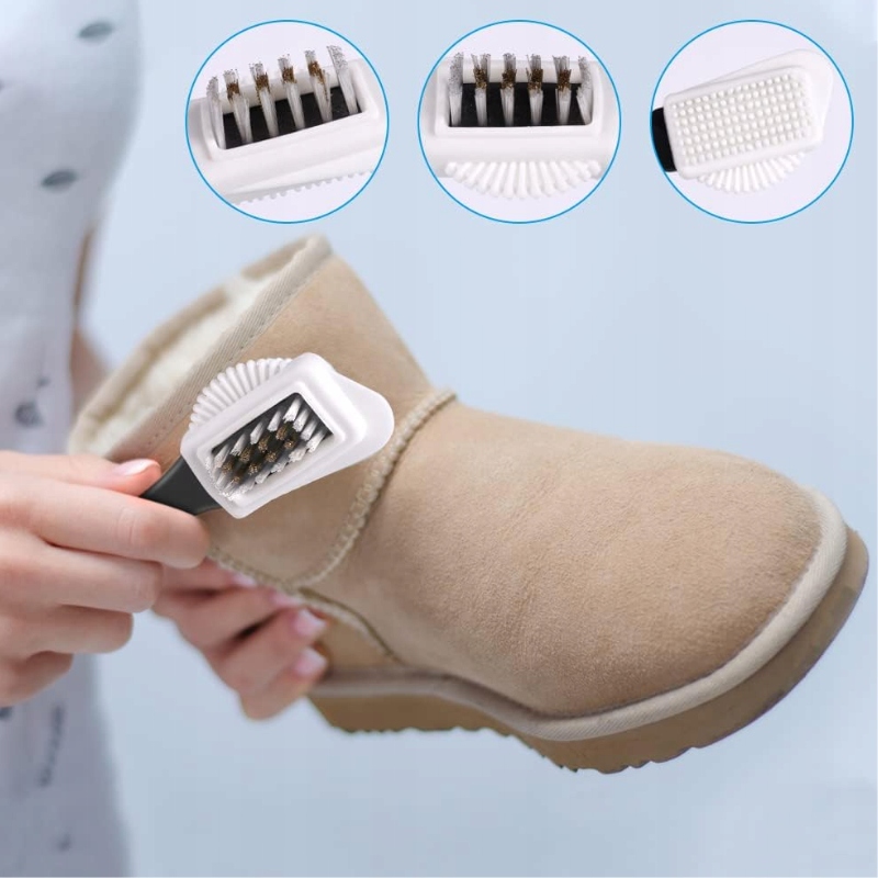 Кисть має гумову щетину, ідеальну для очищення нубука та видалення плям та нейлоново-мобільної щетини, яка обережно видаляє бруд із замусу. Бічні ребра ефективно видаляють постійний бруд з поверхні взуття, швів і країв, а вузька гумова щітка в кінці ідеально підходить для очищення жорстких канавок і порожнин.