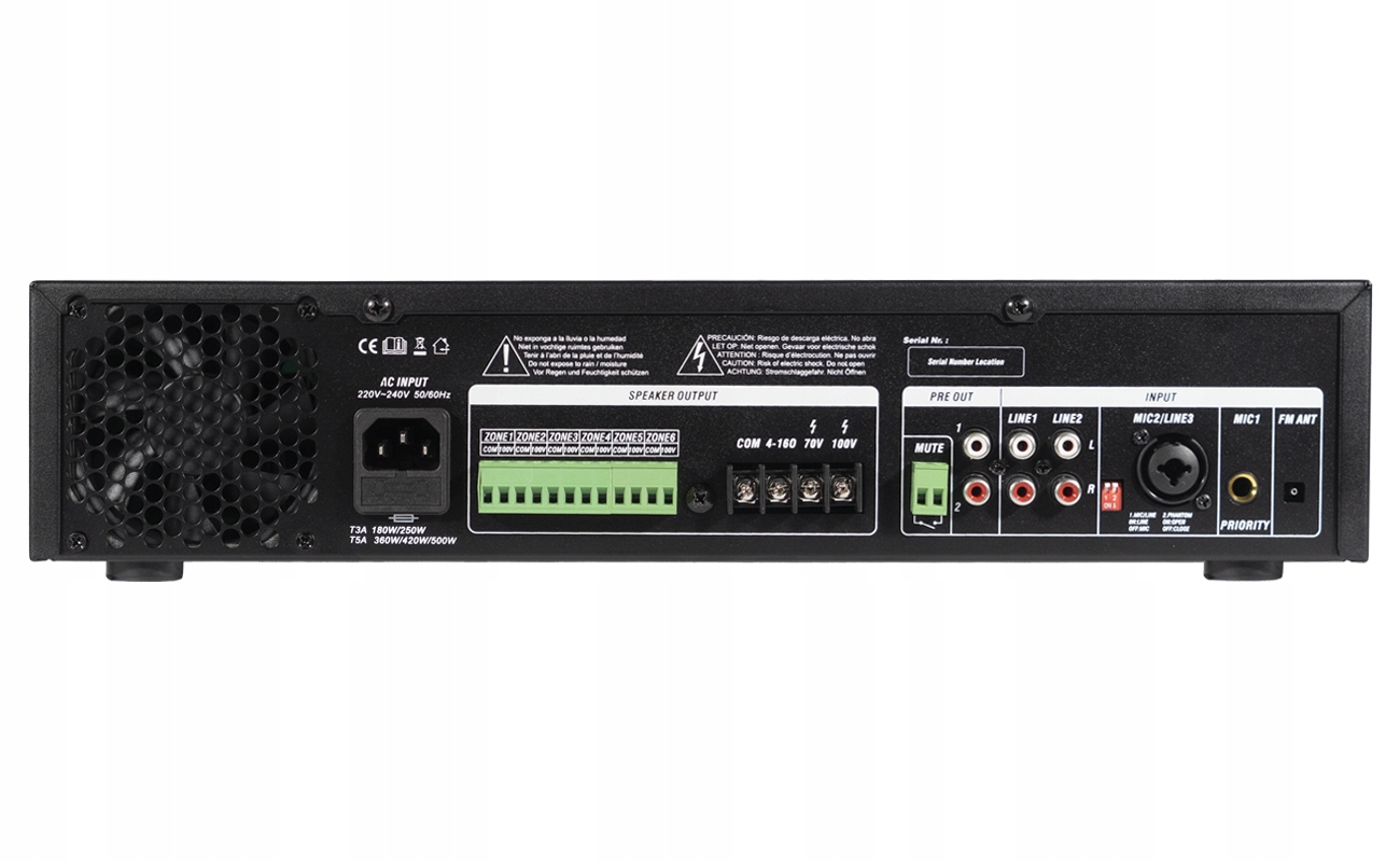 Залежно від моделі пристрій має потужність 180 Вт, 250 Вт і 500 Вт. Кожне з цих значень точно означає загальну потужність динаміків, які ми можемо підключити до виходу 100 В. Для ясності, Уявімо, що ми підключаємо 100< підсилювач /b> V в ресторані. Нам потрібно 18 колонок, 8 в першій кімнаті, 8 в другій кімнаті і 2 колонки в туалеті. У цьому випадку ми можемо підключити до підсилювача всі 18 колонок, якщо кожна з них має максимальну потужність 10 Вт. Подібним чином ми діятимемо з моделями з більшою потужністю.
