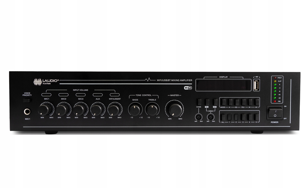 Laudio Multitask — це професійний мікшерний підсилювач, розроблений спеціально для звукових установок середнього розміру. Пристрій дозволяє підключати перетворювачі в резистивну систему або систему 70/100 В. Це дозволяє розділити сигнал на 5 зон з незалежним регулюванням гучності на передній панелі. Залежно від ваших потреб доступні підсилювачі потужністю 120 Вт.