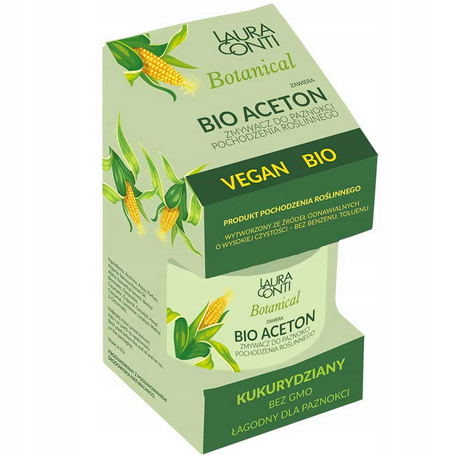 LAURA CONTI Botanical Bio Acetone – це рослинна рідина для зняття лаку на основі органічного ацетону. Не містить бензолу та толуолу. Без ГМО. Біоацетон отримують шляхом бродіння рослинного цукру з кукурудзи в присутності бактерій Clostridium. Сам процес вперше був описаний понад 100 років тому. Цей метод використовується в багатьох країнах, включаючи Англію, США та Канаду. Проте на зміну їй прийшли хімічна та нафтохімічна промисловість. Однак до нього варто повернутися, оскільки він не виробляє небезпечних побічних продуктів.