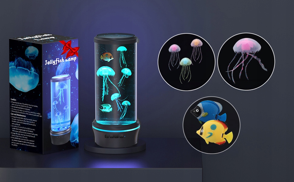 Мініатюрна лампа у формі медузи у стовпі води містить 4 медузи та 2 штучні рибки, має розміри 29x11x11 см і має хороші герметичні властивості.