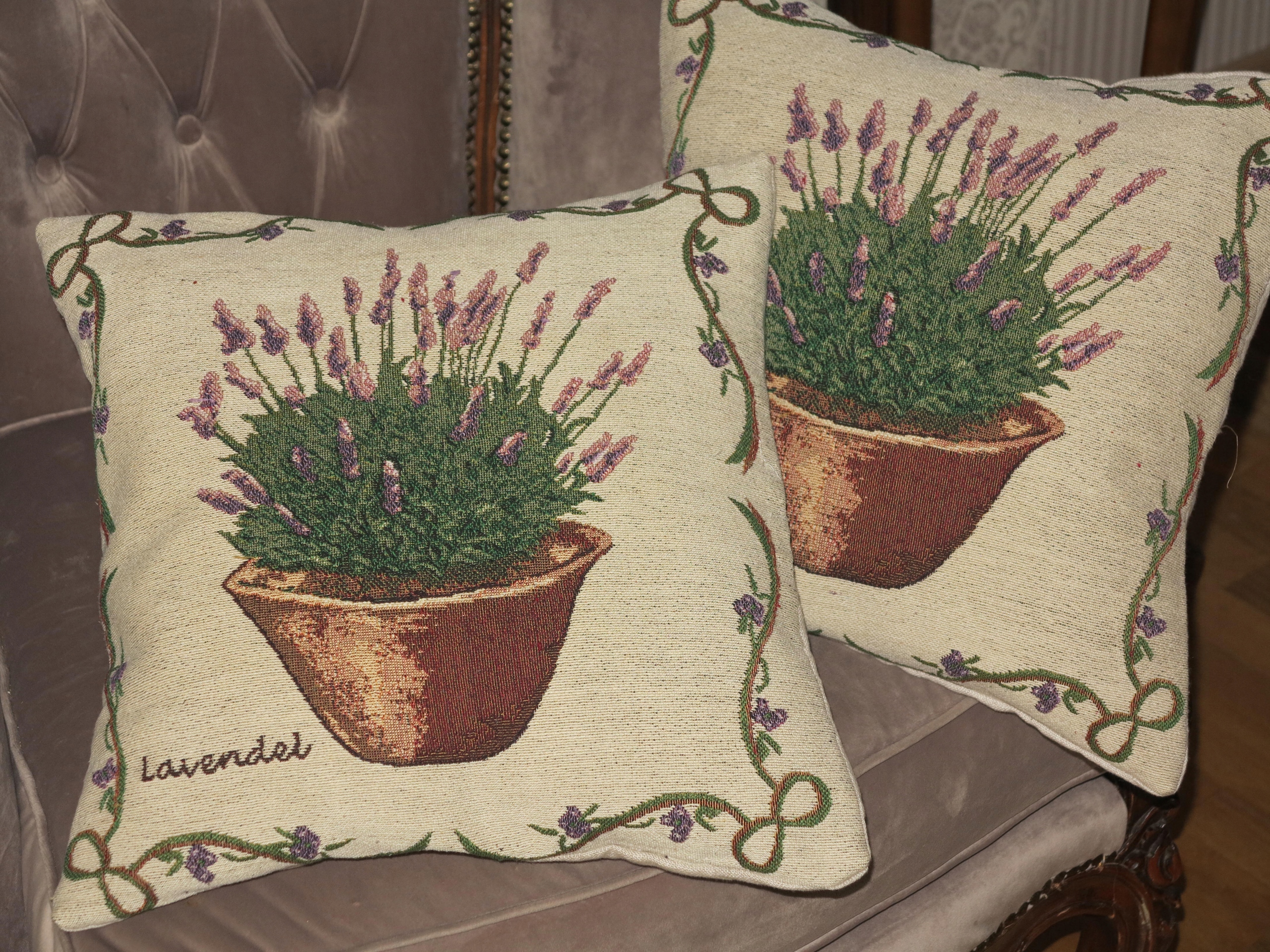 КОМПЛЕКТ ЧУДОВИХ ПОДУШОК ГОБЕЛЕН З ЛАВАНДОЮ. СПИНКА З СУЦІЛЬНОГО ЛЛЯНОГО ПОЛОТНА.