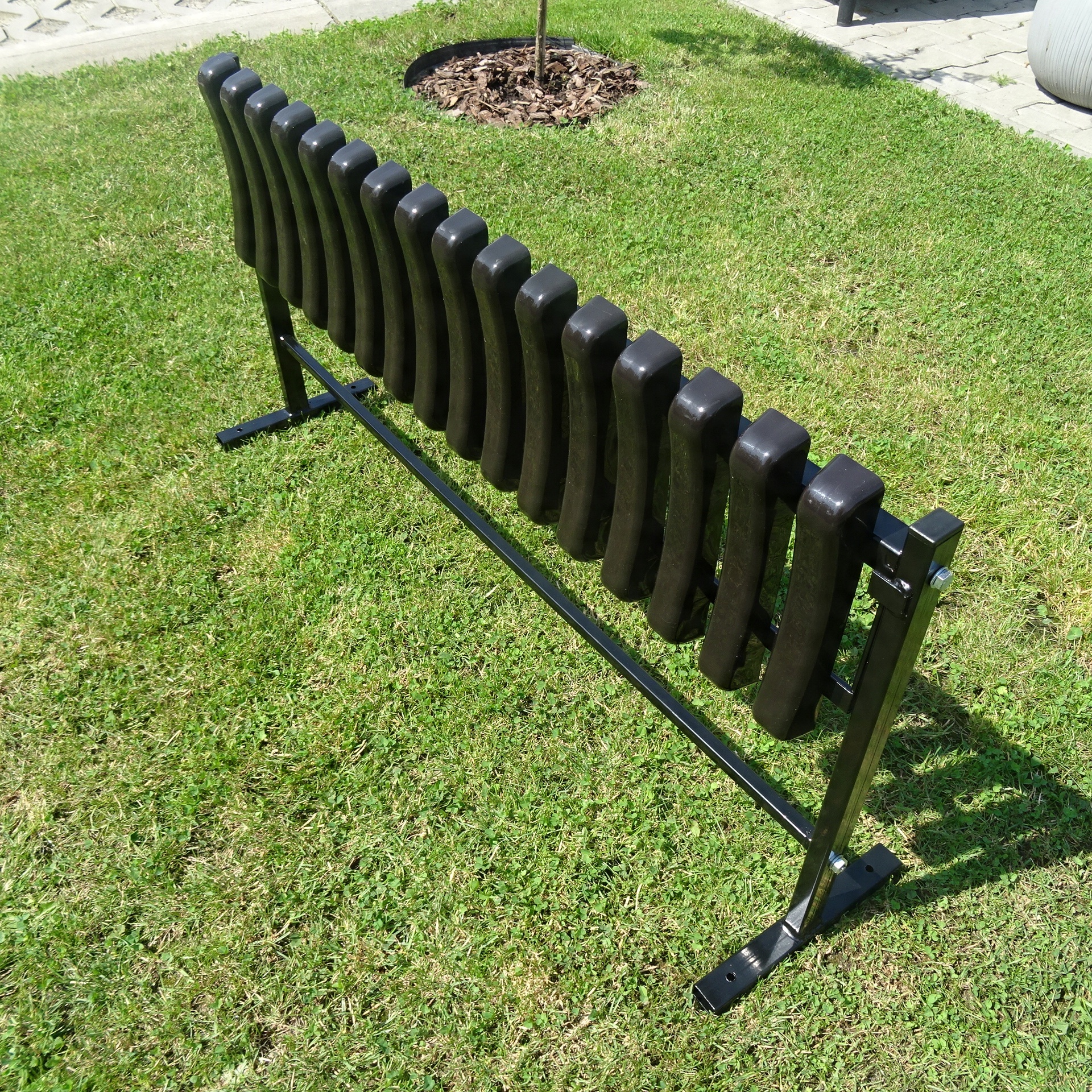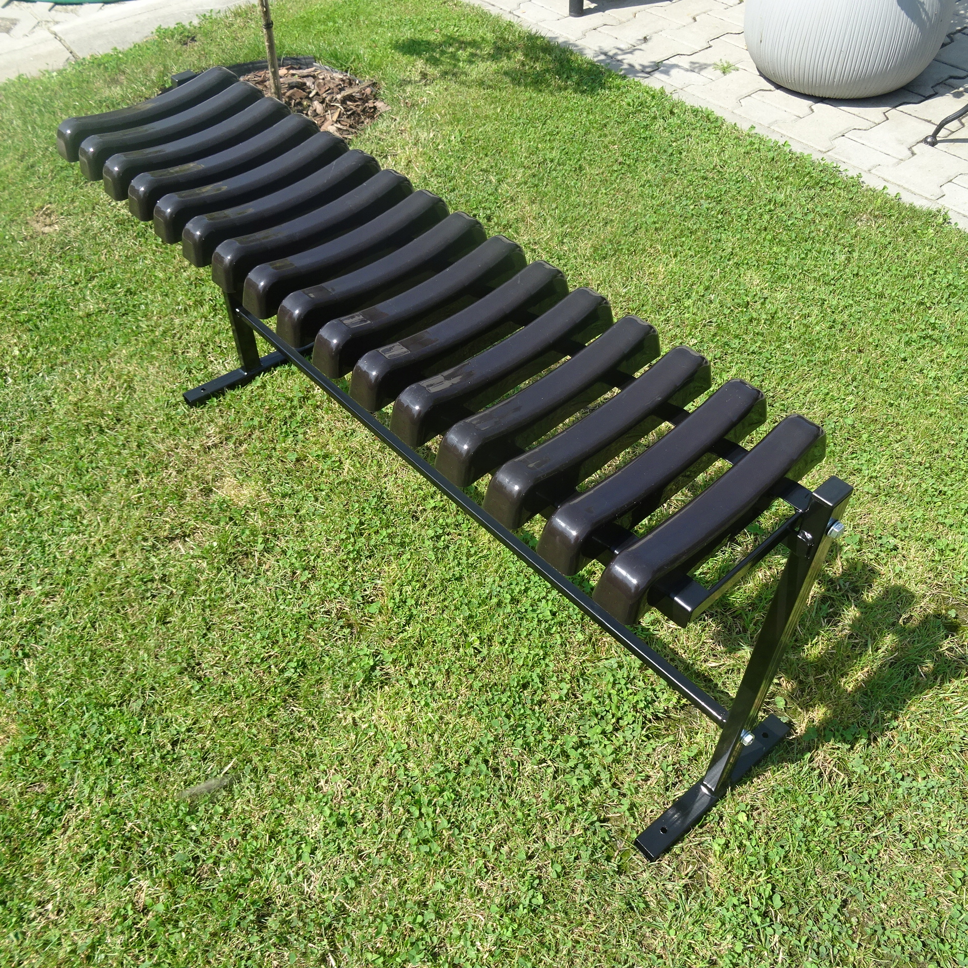 Виготовлена з товстого сталевого профілю з торцевими заглушками та твердим і міцним пластиком на сидінні.