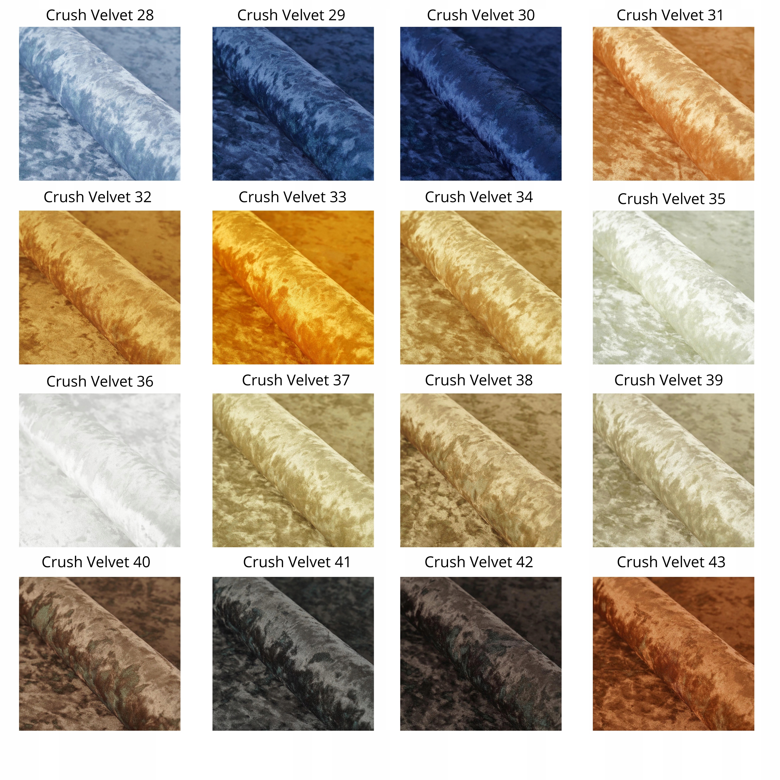 Представлена тканина Crush Velvet - це, іншими словами, подрібнений оксамит або плюш. Він надзвичайно гарний і приємний на дотик, а також блищить, що є його великою перевагою. Висока якість виготовлення, висока гнучкість і стійкість до стирання і пошкоджень гарантують чудову функціональність. Іншою характерною особливістю цього матеріалу є його оптимальна щільність (320 г/м² ± 5%) і той факт, що він безпечний для тварин, що робить його також придатним для оббивки ліжка домашніх тварин. Перш ніж оформити повне замовлення, радимо придбати зразки, щоб підтвердити колір і тип тканини.