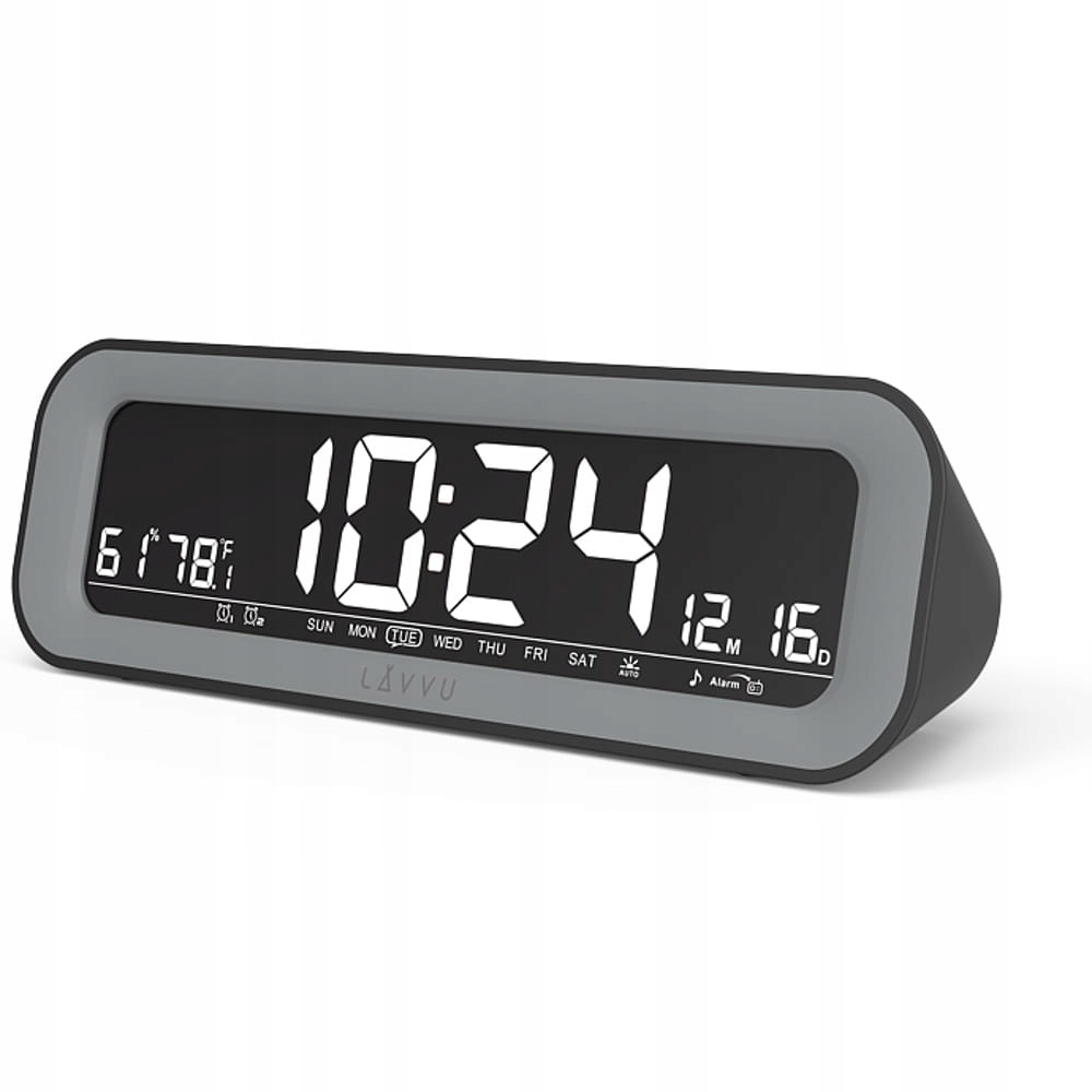 LAVVU SMART - справді розумний помічник для спальні. Він оснащений двома будильниками, кожен з яких можна встановити на кожен день тижня, на вихідні або на певний день тижня. На дисплеї також відображається дата і день тижня, температура і вологість повітря. Оскільки сигналізація живиться від кабелю, що входить у комплект, вам не доведеться постійно мати справу з розрядженими батареями. На задній панелі будильника також є 2 USB-порти, які можуть заряджати до 2 телефонів одночасно протягом ночі, тож у вас є все в одному місці – на тумбочці біля ліжка.